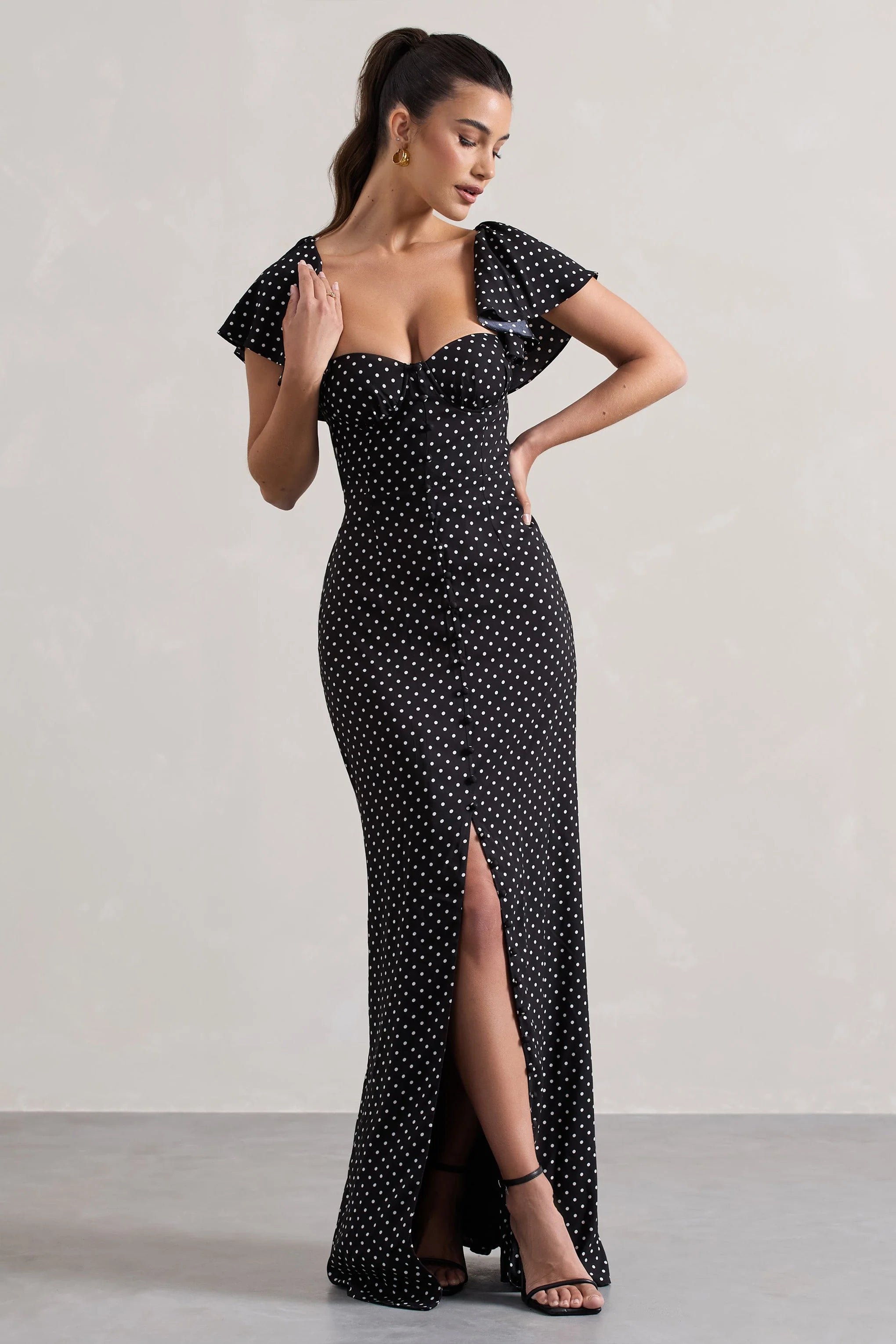 Signorina is the angelic maxi dress to showcase your curves in the summer sun. Cut from a luxurious lightweight fabric, this black polka dot dress features a sweetheart neckline with softly-ruched cups and short flounced sleeves. Embellished with a line of delicate covered buttons, Signorina is the maxi dress to see you through every summer occasion.