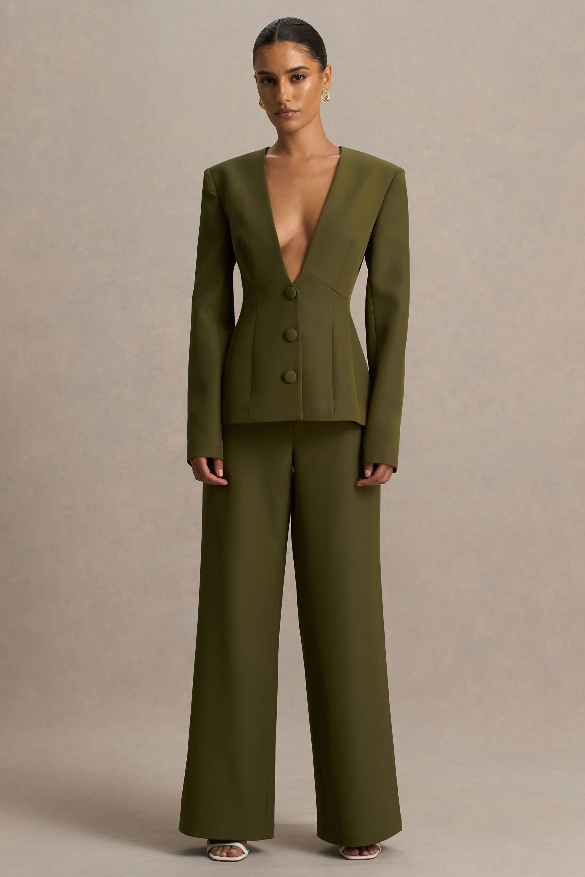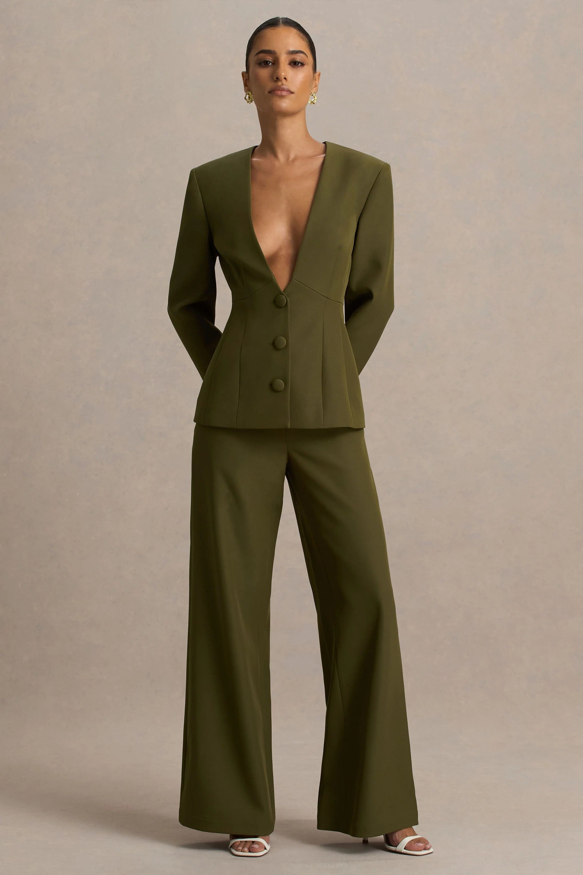 Introducing Silvia, a versatile wardrobe staple that's tailored to perfection for modern elegance. Crafted from our premium stretch crepe in a classic olive hue, these trousers are designed to flatter while exuding timeless sophistication. Featuring angled pockets that nod to sleek tailoring and a fluid wide-leg silhouette that elongates the frame, Silvia transitions seamlessly from desk to dinner. Pair with our Rosalina blazer for a look that'll command attention.