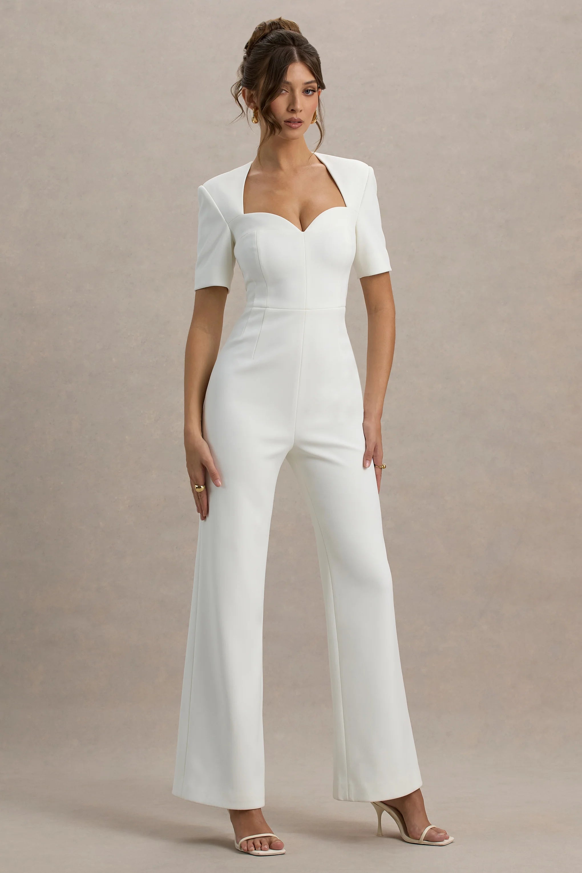 Defined by sophisticated details and modern elegance, Simone is a standout piece for your next special occasion. Crafted from our premium crepe, this white jumpsuit features a flattering sweetheart neckline and chic short sleeves that exude timeless allure. The wide-leg silhouette creates a dramatic flow, designed to elongate your frame while adding effortless glamour. Perfect for evening events or cocktail parties.