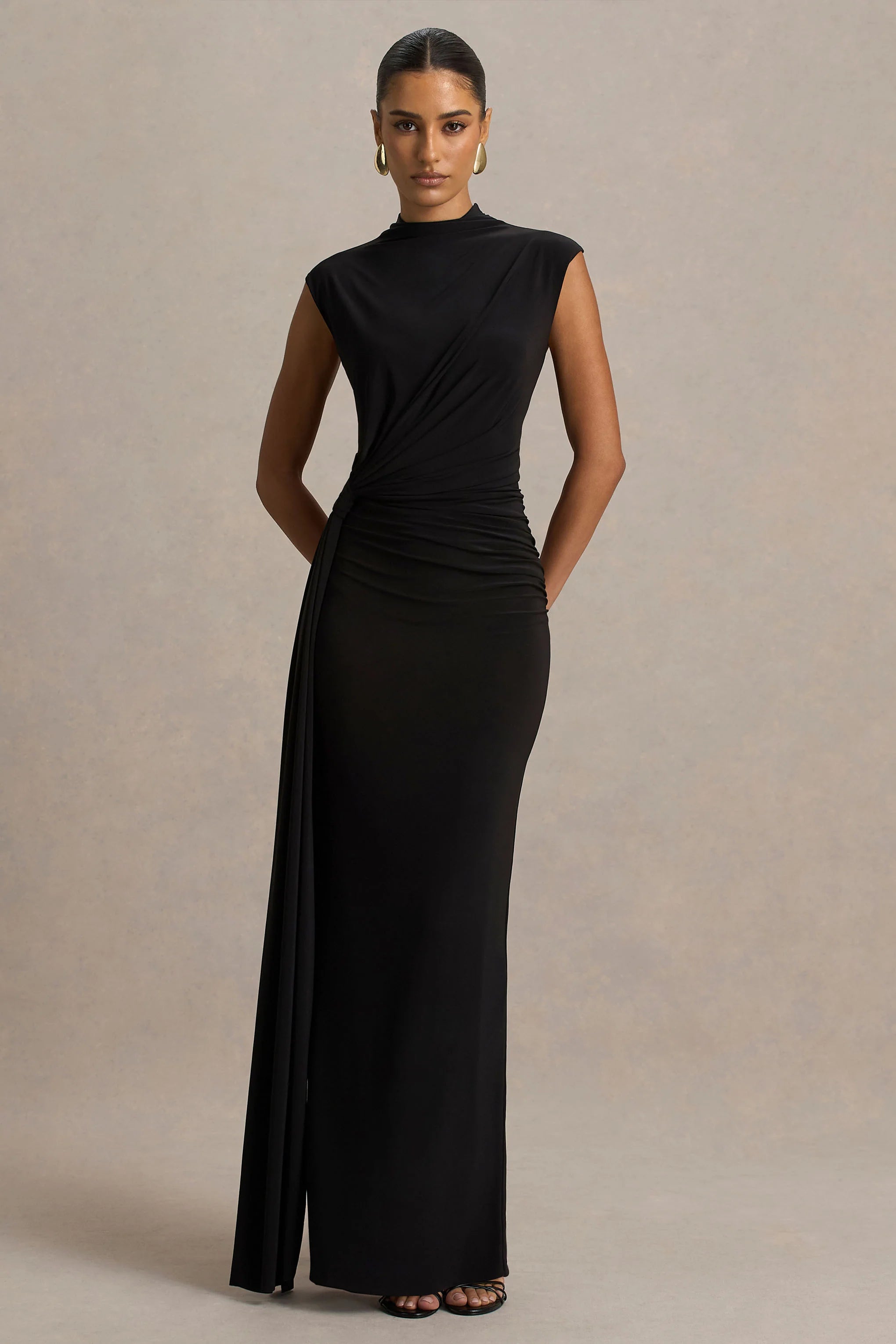 Meet Solene, the dress that demands attention with its sultry sophistication and timeless glamour. Crafted from our signature premium stretch jersey, this maxi-length beauty comes in a rich black tone that hug your curves to perfection. Featuring a sleek high neckline for understated elegance, Solene turns heads with its statement twist knot and cascading sash detail that cinches the waist while elongating the silhouette. The fluid drape skims over the body, creating a figure-flattering shape that’s as comfortable as it is captivating. Effortlessly chic, this is the showstopper your evening wardrobe has been waiting for.