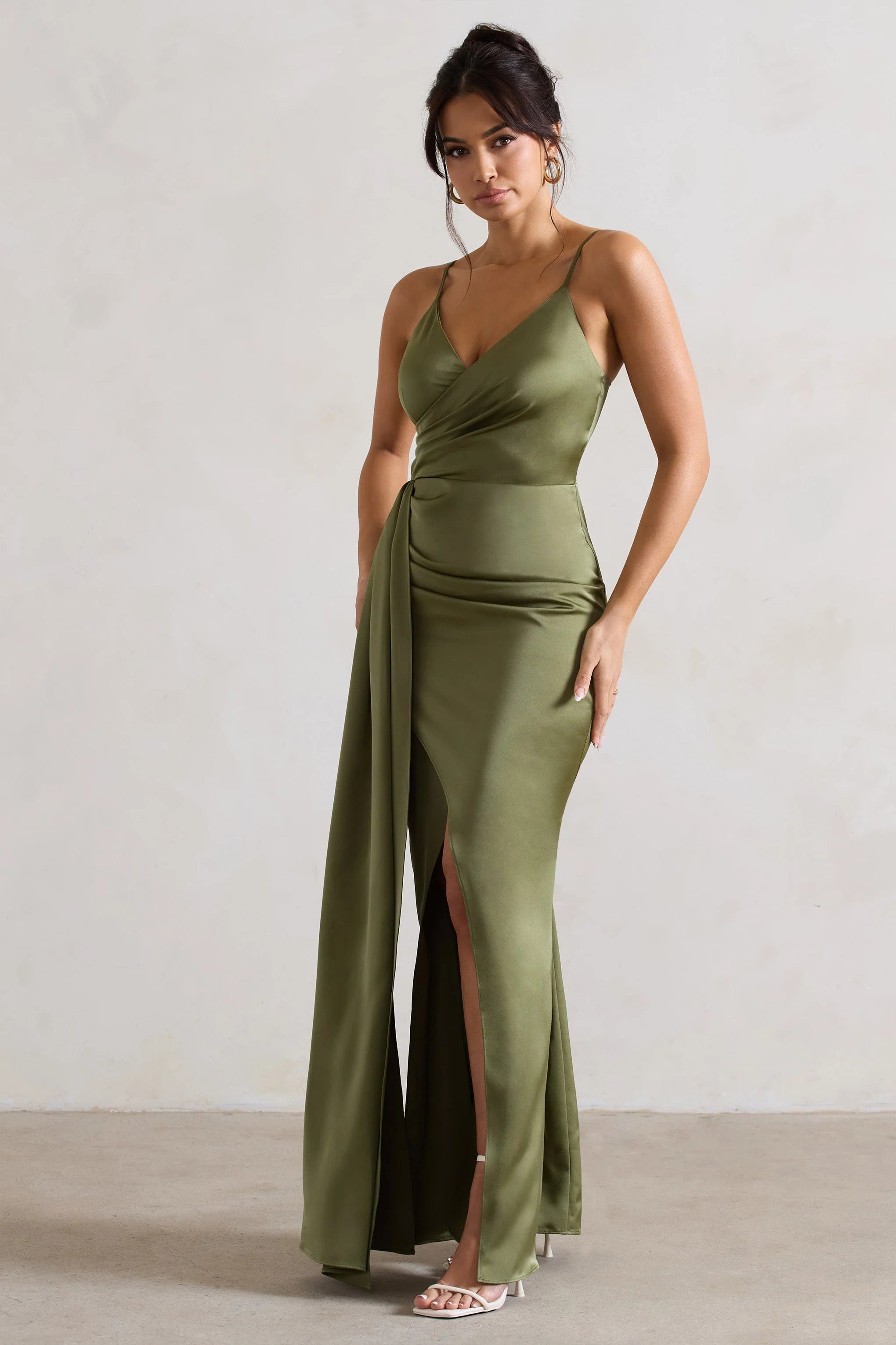 Whether your an attendee or part of the wedding party, Soraya is a timeless option. Designed in a soft olive green shade of a sumptuous satin, this style offers a v neckline equipped with adjustable cami straps for that perfect custom fit. Complete with an alluring wrap skirt and floor-length drape, keep Soraya at the forefront with a tousled bun and statement earrings.