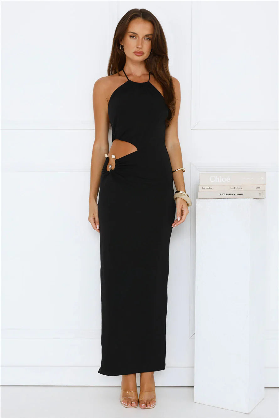 Be seen in an exclusive style, lovely. The South Of France Halter Maxi Dress features a sophisticated design with its halterneck tie adorned with marble-style beading, a gold embellishment at the hip, a waist cutout, and an elegant split to the skirt. Ideal for luxurious occasions, it combines timeless style with modern allure.