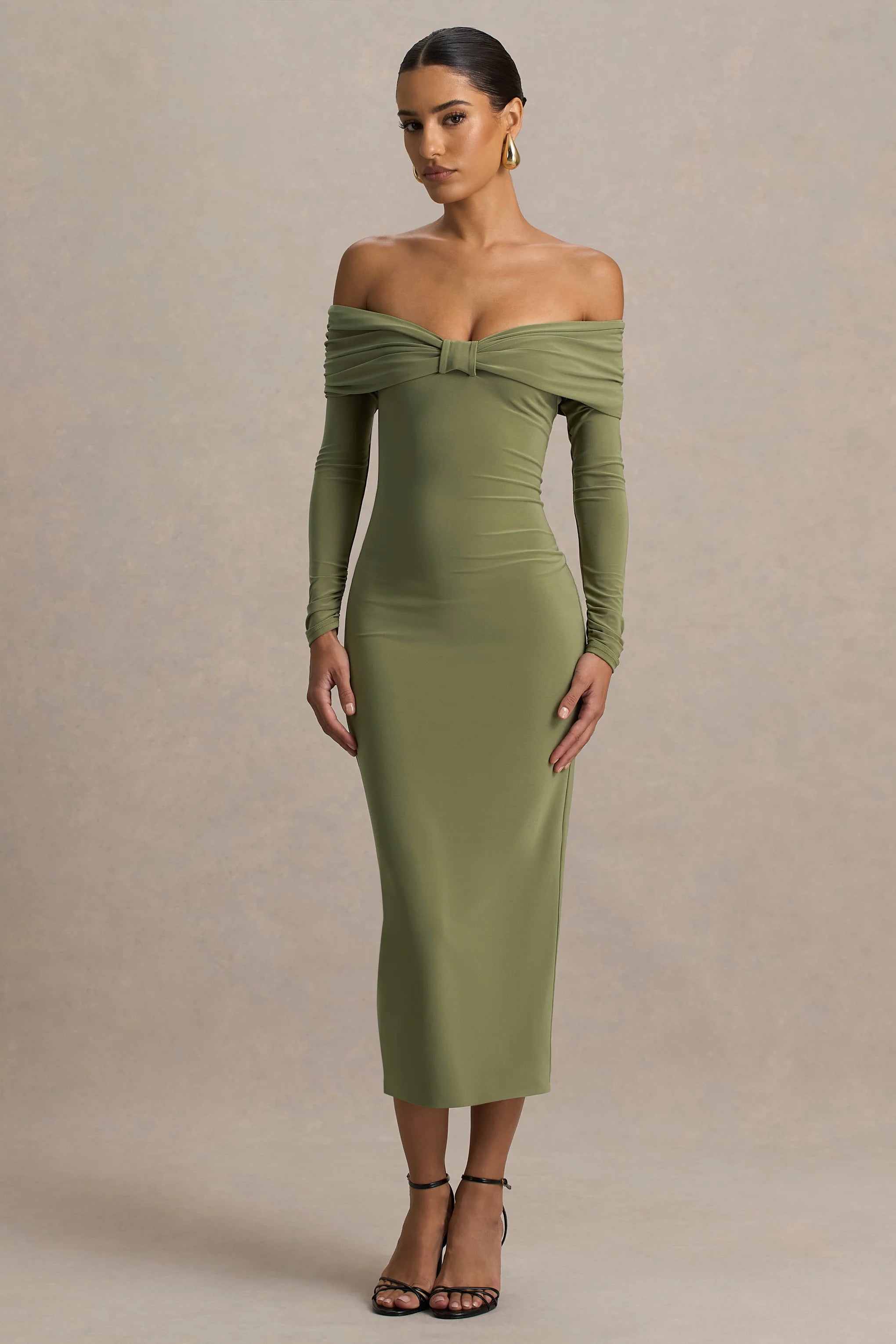 Turn heads effortlessly in Spark, a dress designed for unforgettable entrances. Cut from our premium stretch jersey in a rich olive hue, this midi-length piece sculpts your figure while offering a luxurious edge . The elegant bardot neckline frames the décolletage, complete with a delicate bow detail for a touch of femininity. The long sleeves and ruched detailing enhance the sleek silhouette, while the centre-back split ensures ease of movement with a hint of allure. Effortlessly chic, Spark is the definition of understated glamour.