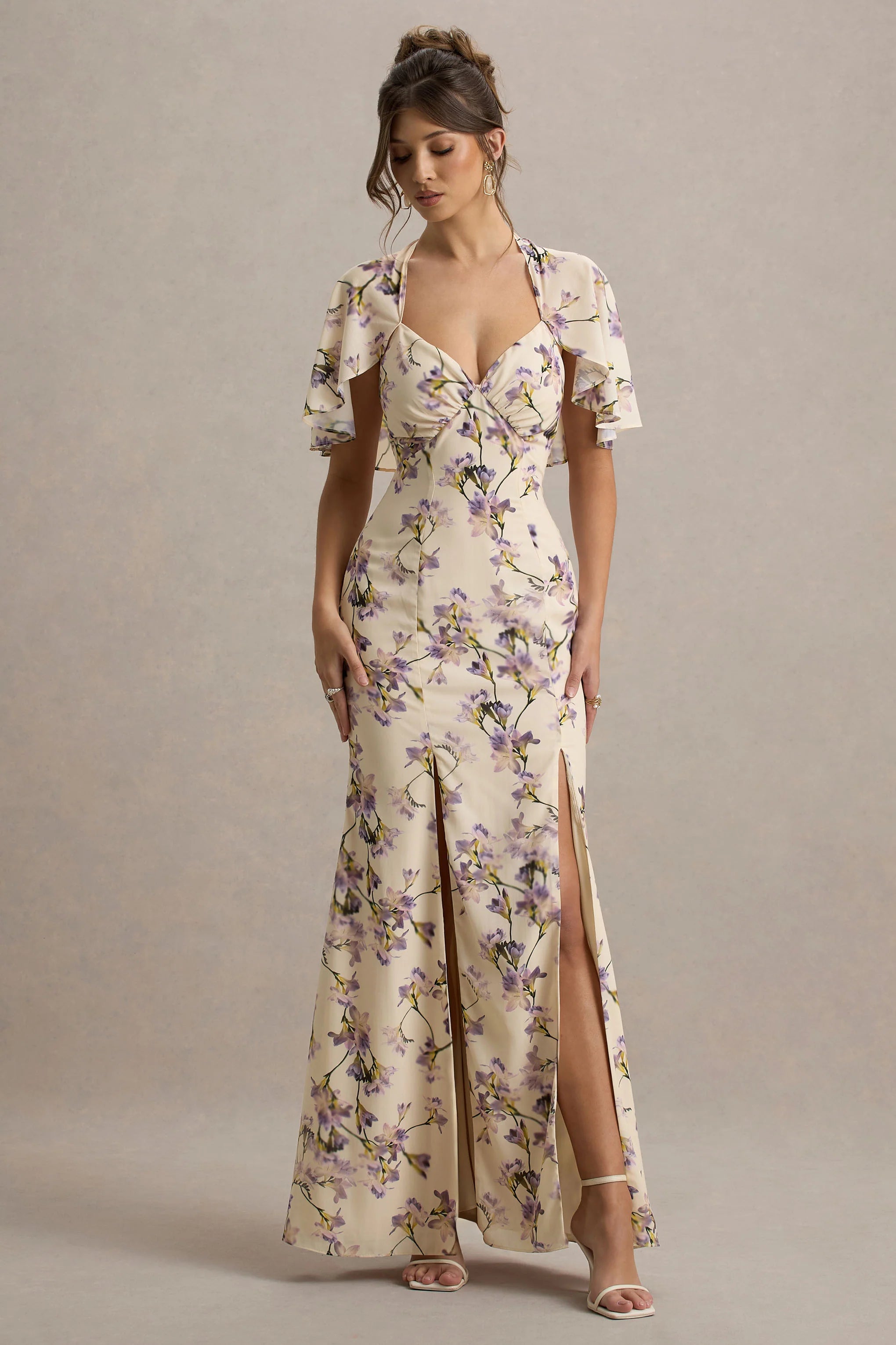 A refreshed silhouette for sunnier days, opt for soft sophistication in Stila. Arriving in a lemon floral print of our breezy woven fabric, this floor-length maxi dress is defined by a classic v neckline, fluttering cape sleeves and two centre splits. Style yours with some sparkling accents like Glimmery for the perfect summer wedding ensemble.