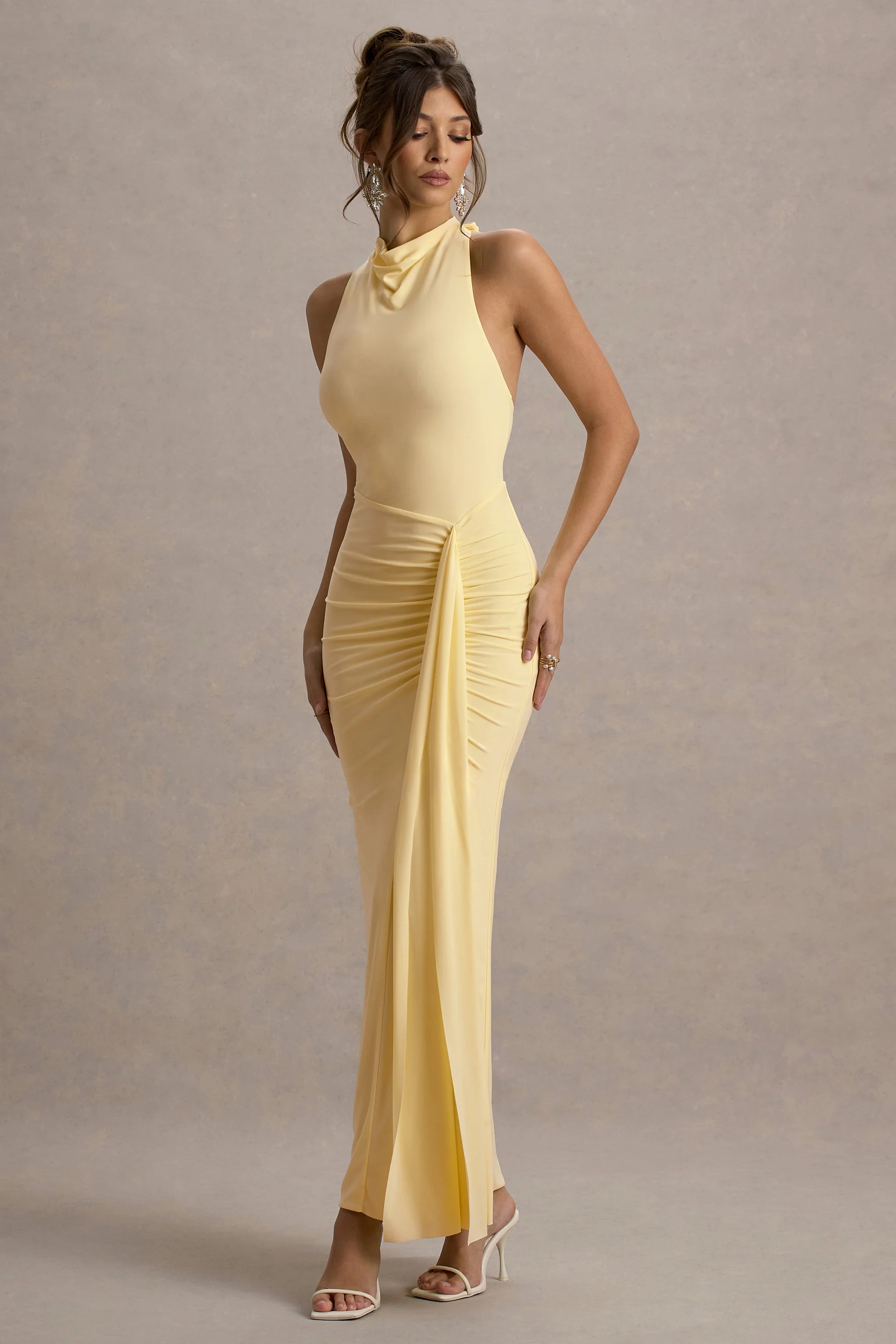 The epitome of class and elegance, Sunflower is defined by its flattering silhouette. Crafted in our premium jersey in a stunning pale lemon shade, this maxi seamlessly blends a high neckline, a ruched waist and a high leg split. Style yours with bold accents for a look of utter sophistication.