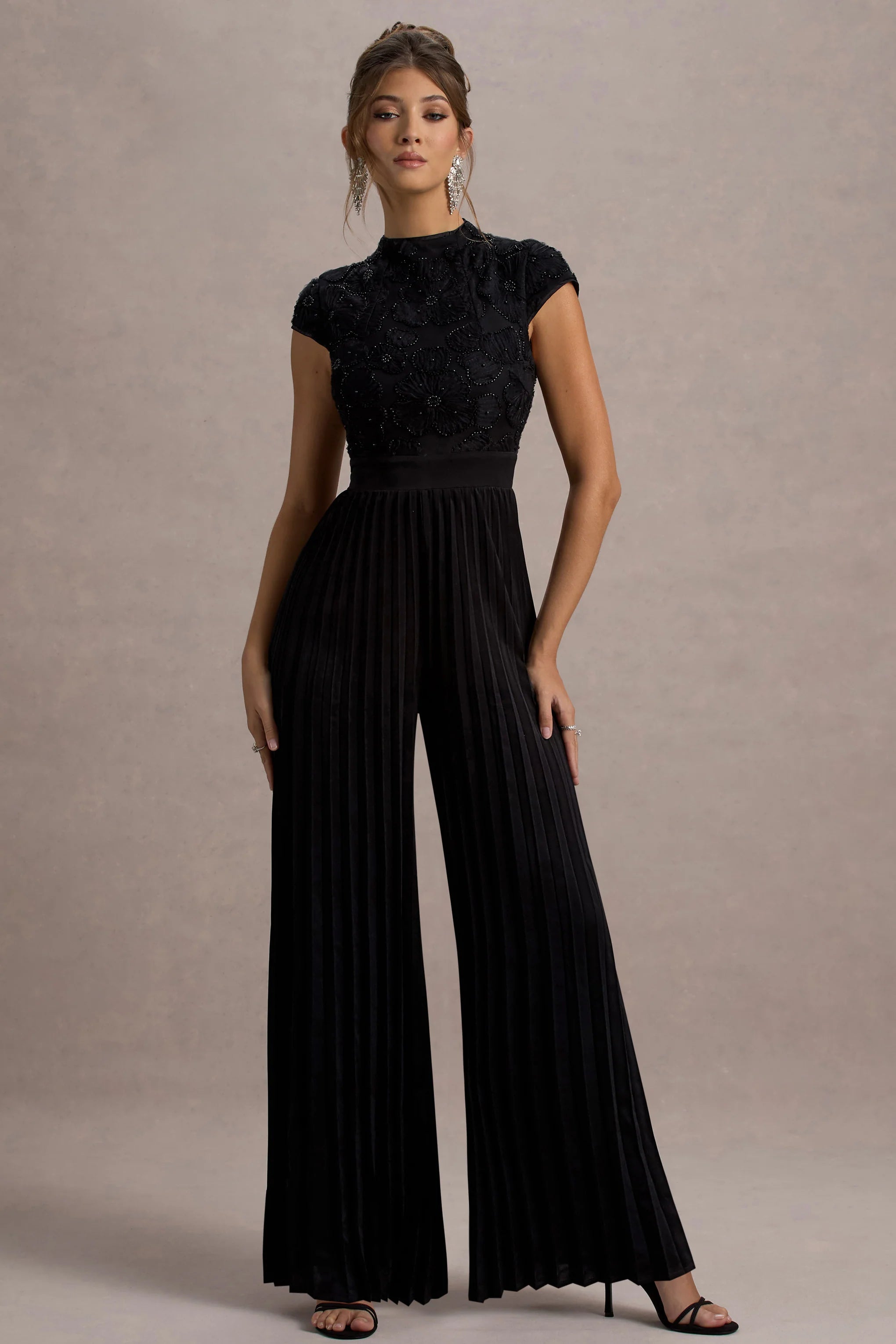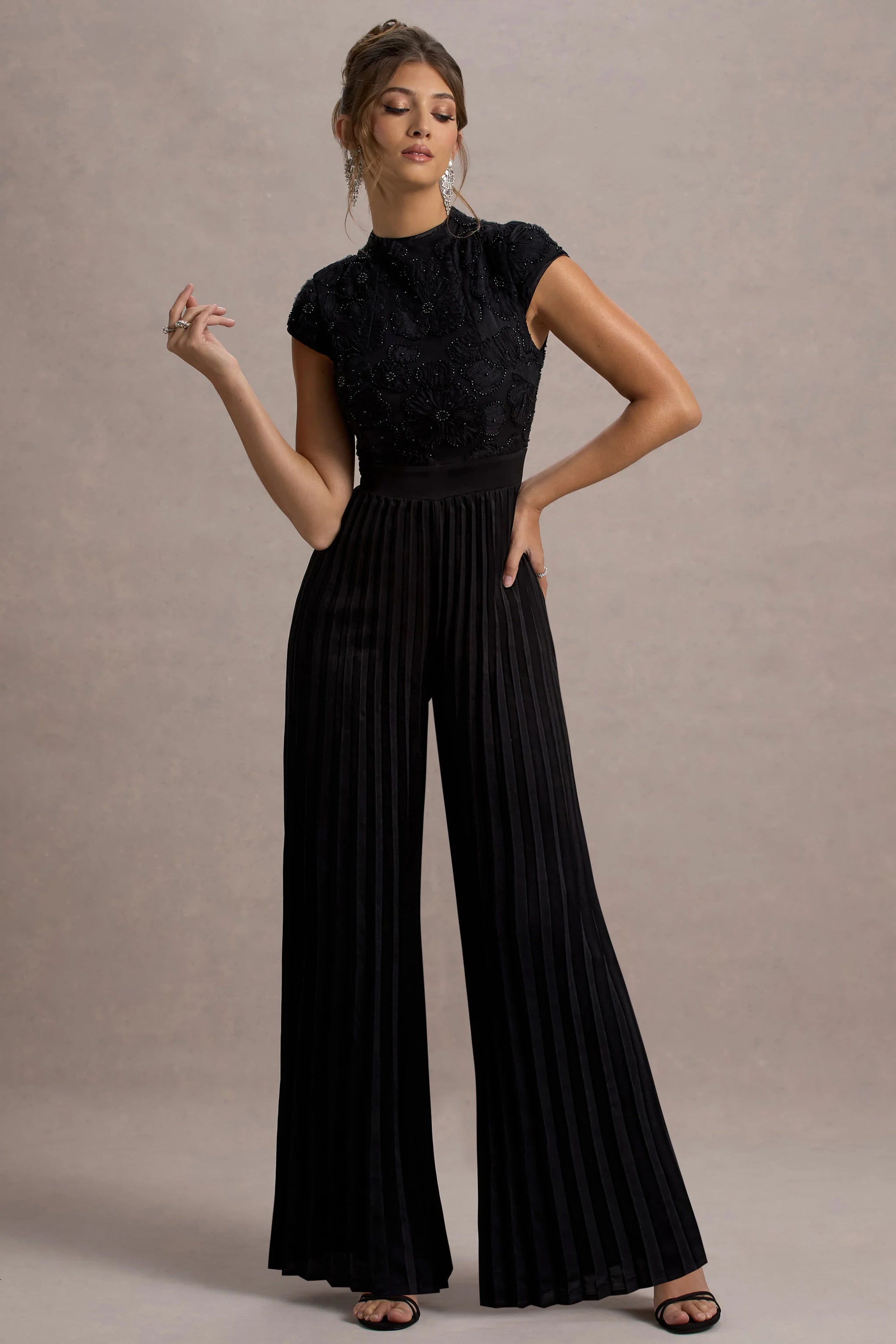 Designed for special events, add Tanner to your evening repertoire. Designed with a stunning hint of sparkle and embellished detailing that shines as you move, this black jumpsuit is perfect for any party you have on the roster. Complete with wide plisse legs, whats not to love with Tanner?