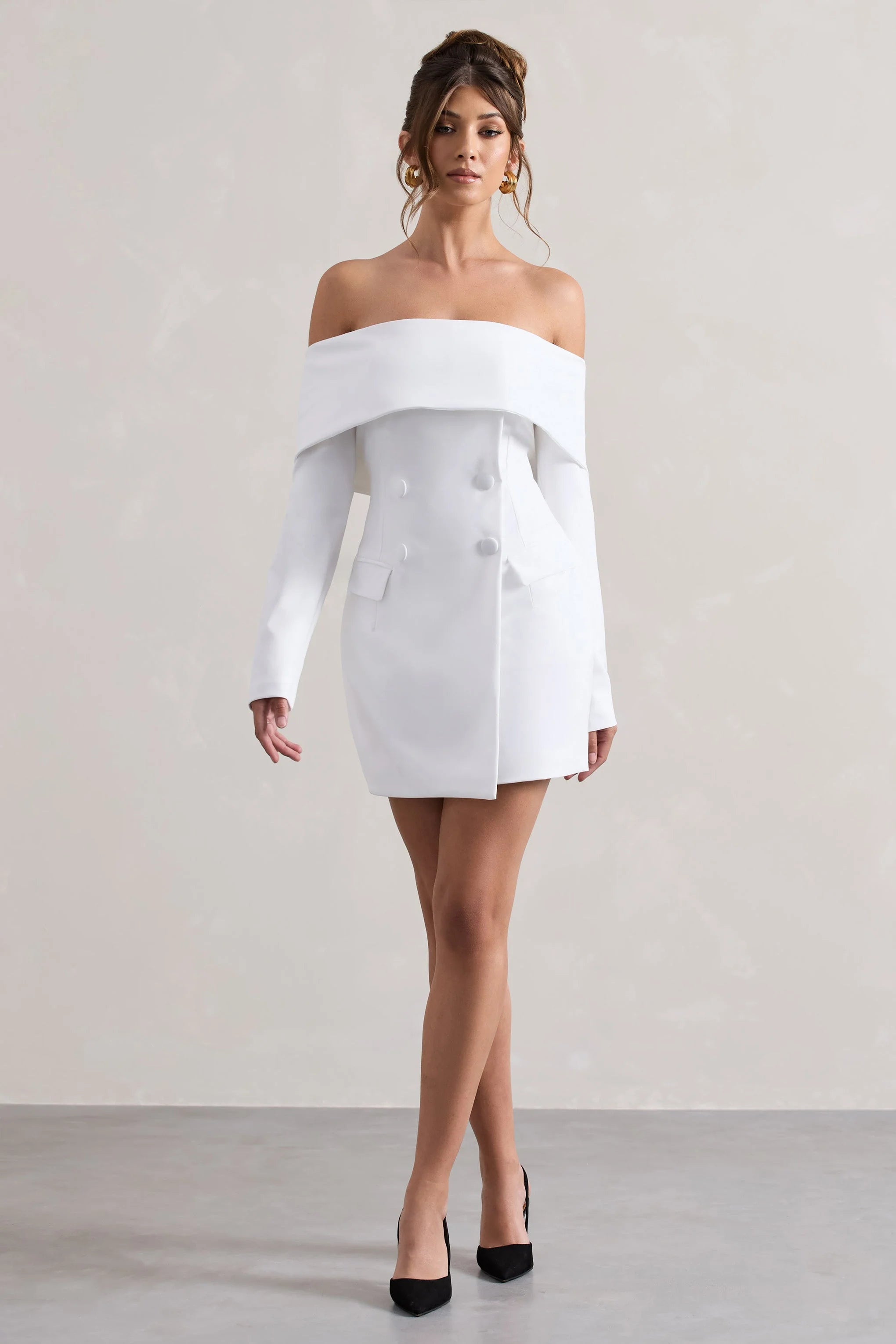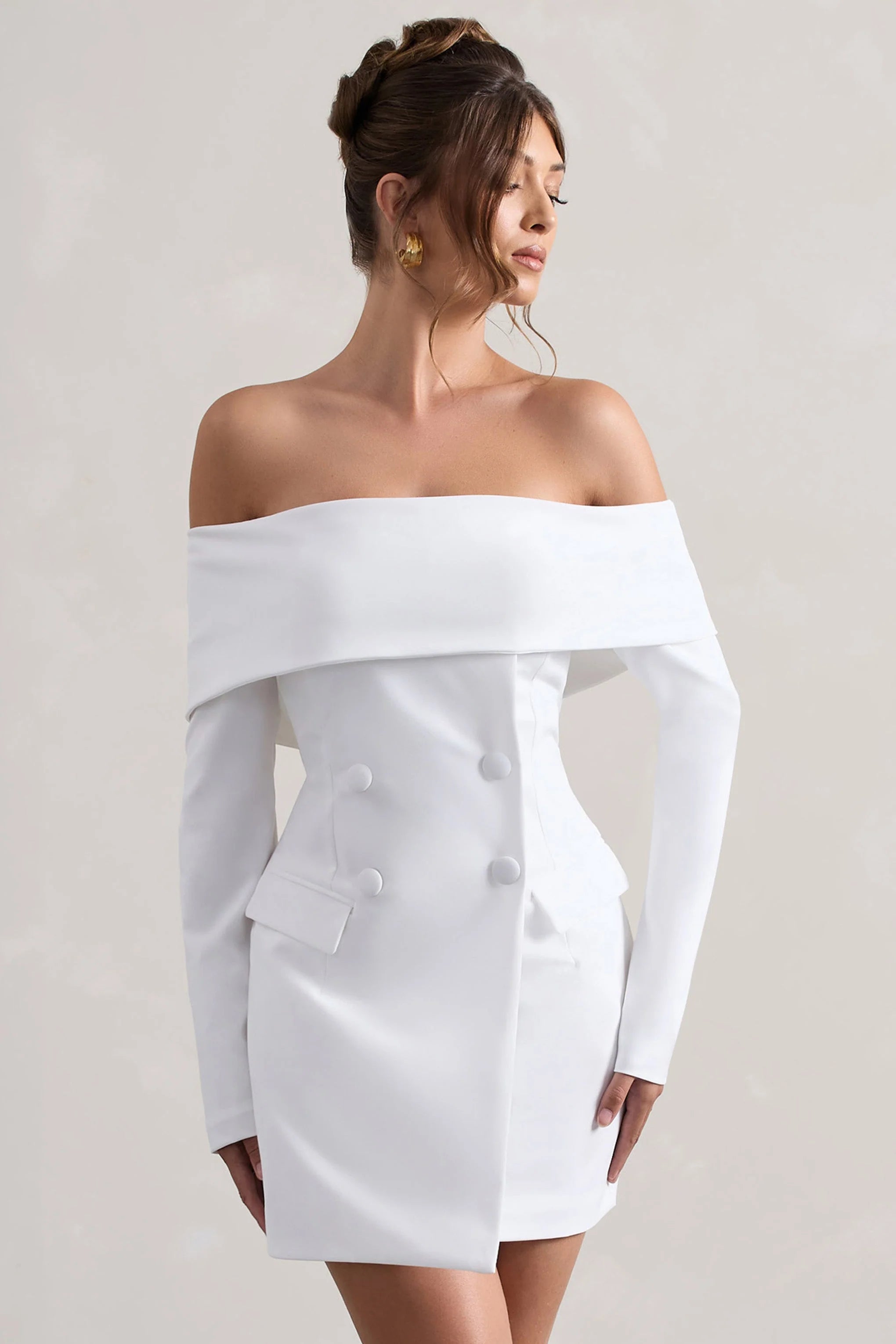 Timeless and sophisticated, say hello Tara. This white tailored mini dress has been crafted in our premium stretch crepe that sits elegantly off the shoulders, boasting a flattering bardot neckline. Finish off this classic look by styling it with a sleek bun and our Hear Me court heels.