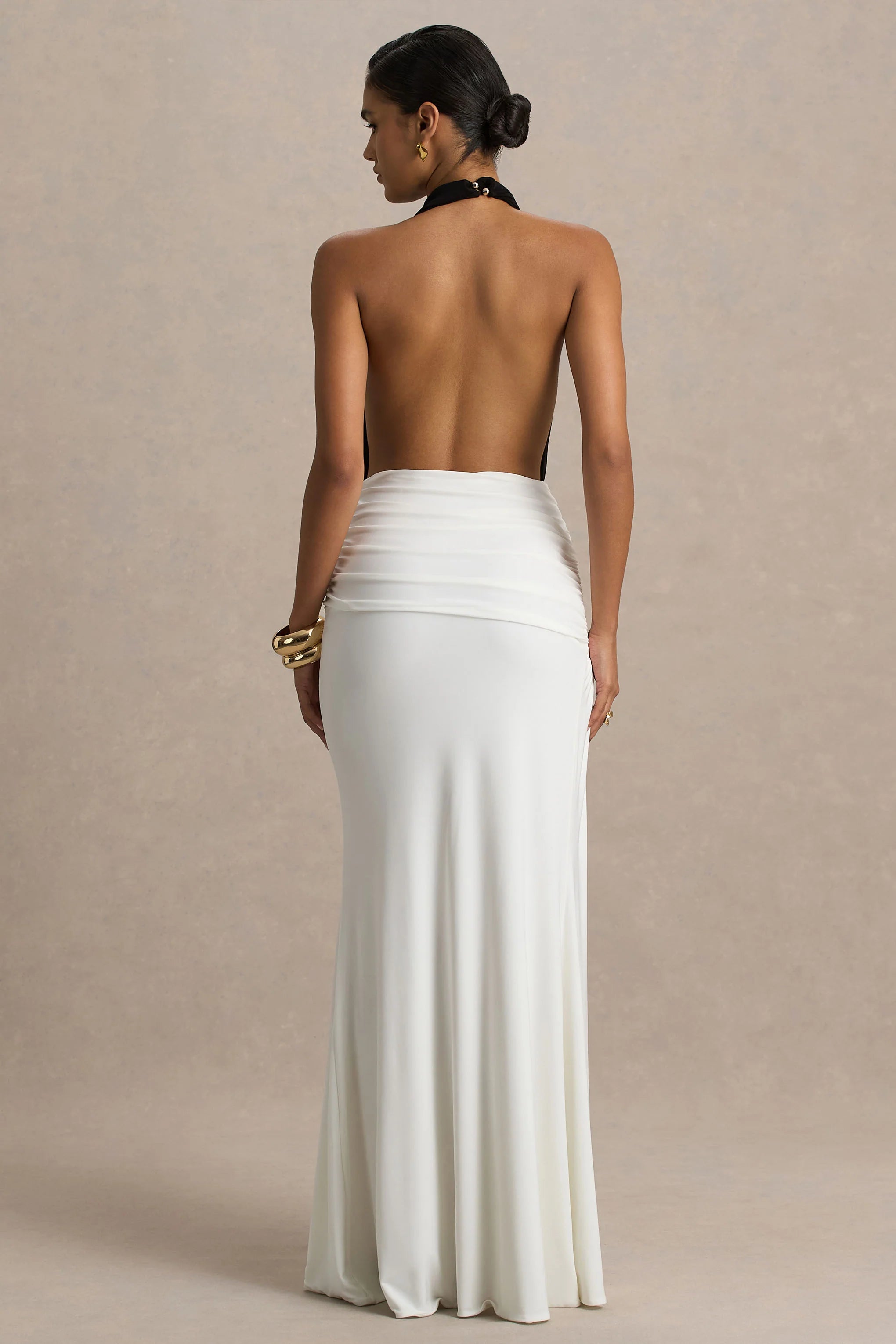 Make an entrance they won’t forget in Tilly, a sultry silhouette designed to turn heads. Cut from our sculpting stretch jersey in rich black and white hues and flowing to a maxi length, this gown brings glamour to every moment. The extreme plunge neckline and wrap detailing accentuate your curves, while ruching through the waist enhances and flatters the figure. The open-back finish adds an unexpected touch of allure, ensuring you captivate in every room. Style with sleek heels and gold accessories for your next special occasion.