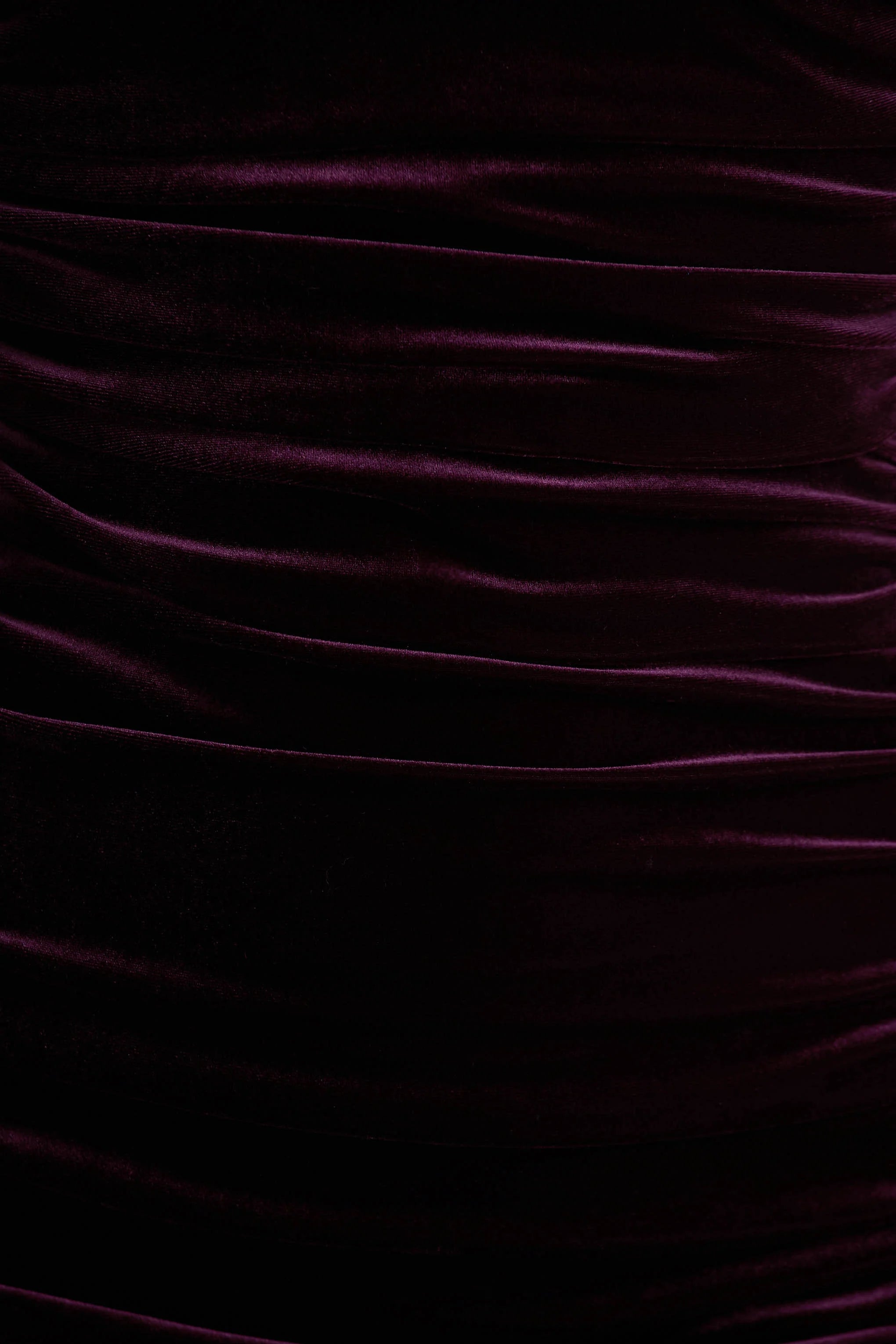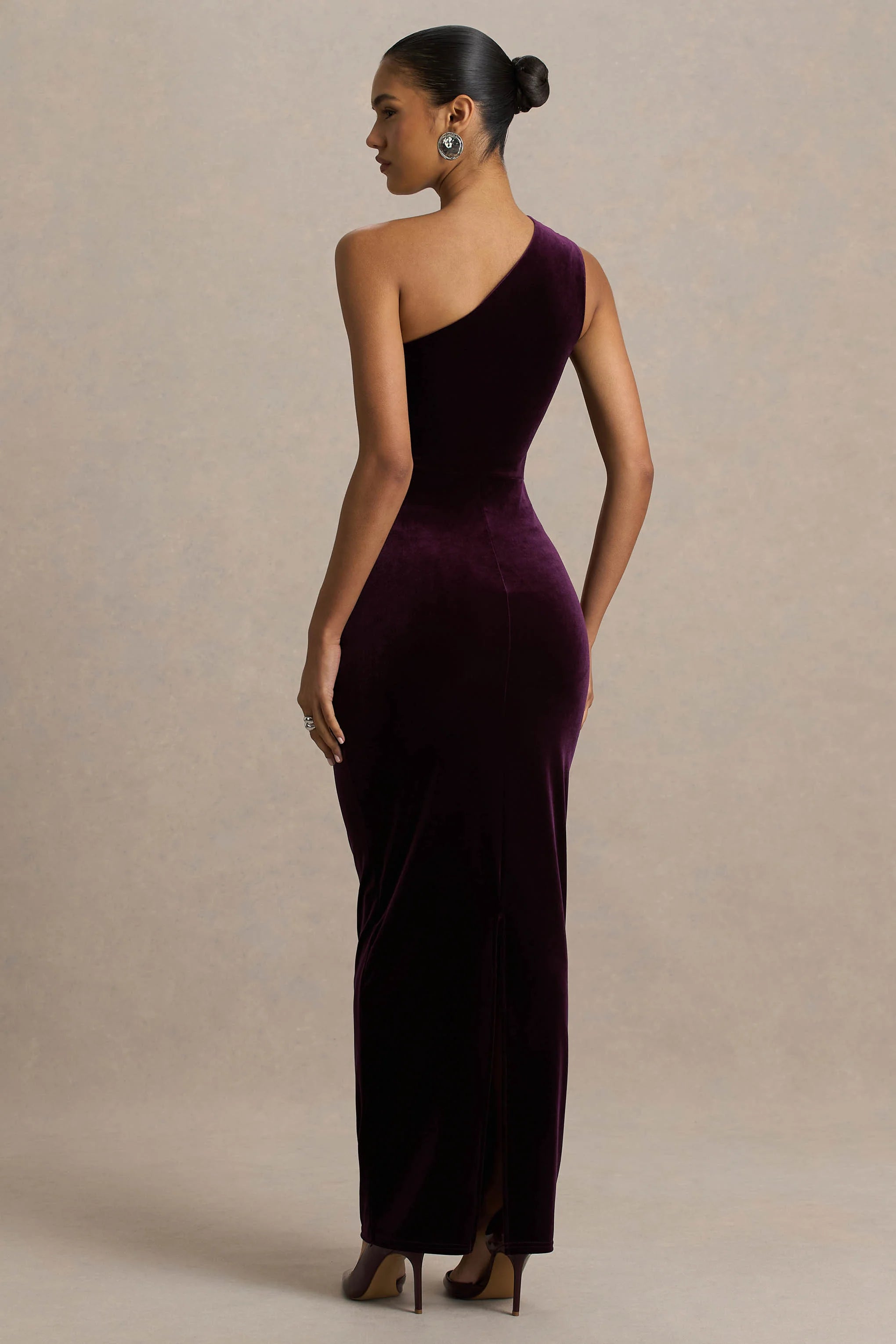 Introducing Treat, the maxi dress that redefines after-dark allure. Cut from our premium velvet in a deep burgundy hue, this sleek silhouette is designed to contour and captivate. The asymmetric neckline adds a modern twist, while the all-over ruched detailing sculpts your figure to perfection. Finished with a sultry centre-back split , Treat is the ultimate show-stopper for statement evenings.