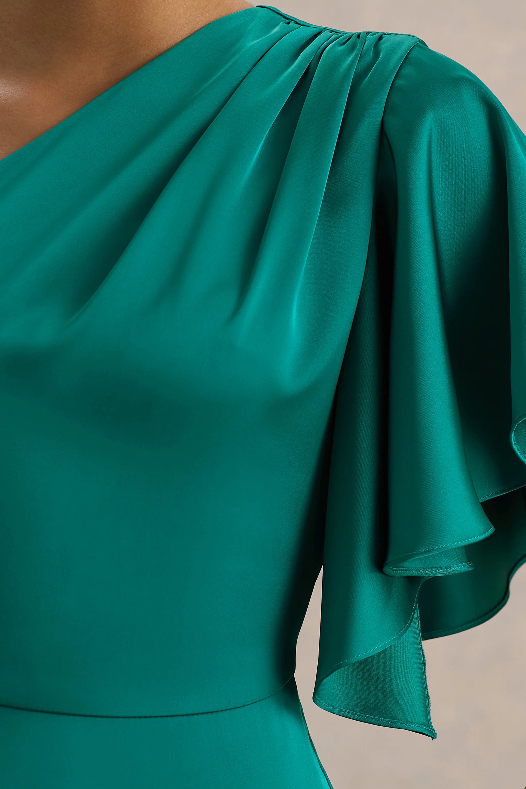 Steal the spotlight at your next special occasion in Unforgettable. Crafted from our premium bottle green satin, this maxi glides over the body with a luxe, silky finish. The asymmetric neckline and waterfall frill sleeve create an effortlessly elegant silhouette, while the wrap skirt and asymmetric pleated waist detailing enhance your shape. A centre back split adds a subtle hint of allure, making this dress perfect for evening soirées, weddings or moments that demand to be remembered. Style with sleek heels and a chic up-do to finish the look.
