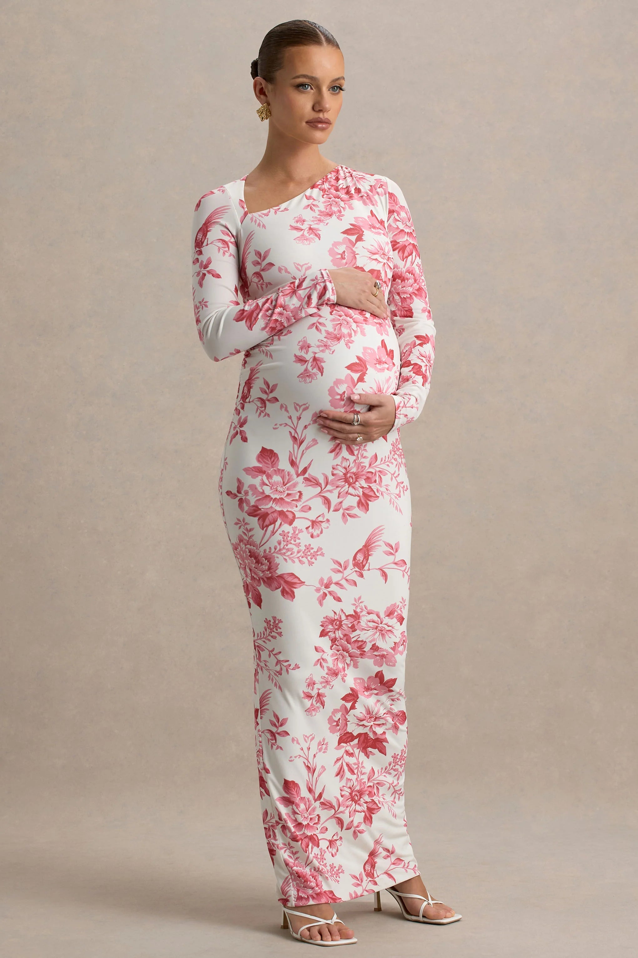 Bloom with confidence in our Vanette maxi, designed for both elegance and comfort, its the perfect maxi for your spring summer wadrobe. Crafted from our premium stretch jersey, to hug your figure beautifully whilst ensuring comfort. The pink floral print brings femininity, while the asymmetric neckline and statement bell sleeves add a touch of modern sophistication. Thoughtfully designed with ruching at the bump to enhance your silhouette, this dress is ideal for baby showers and special occasions.