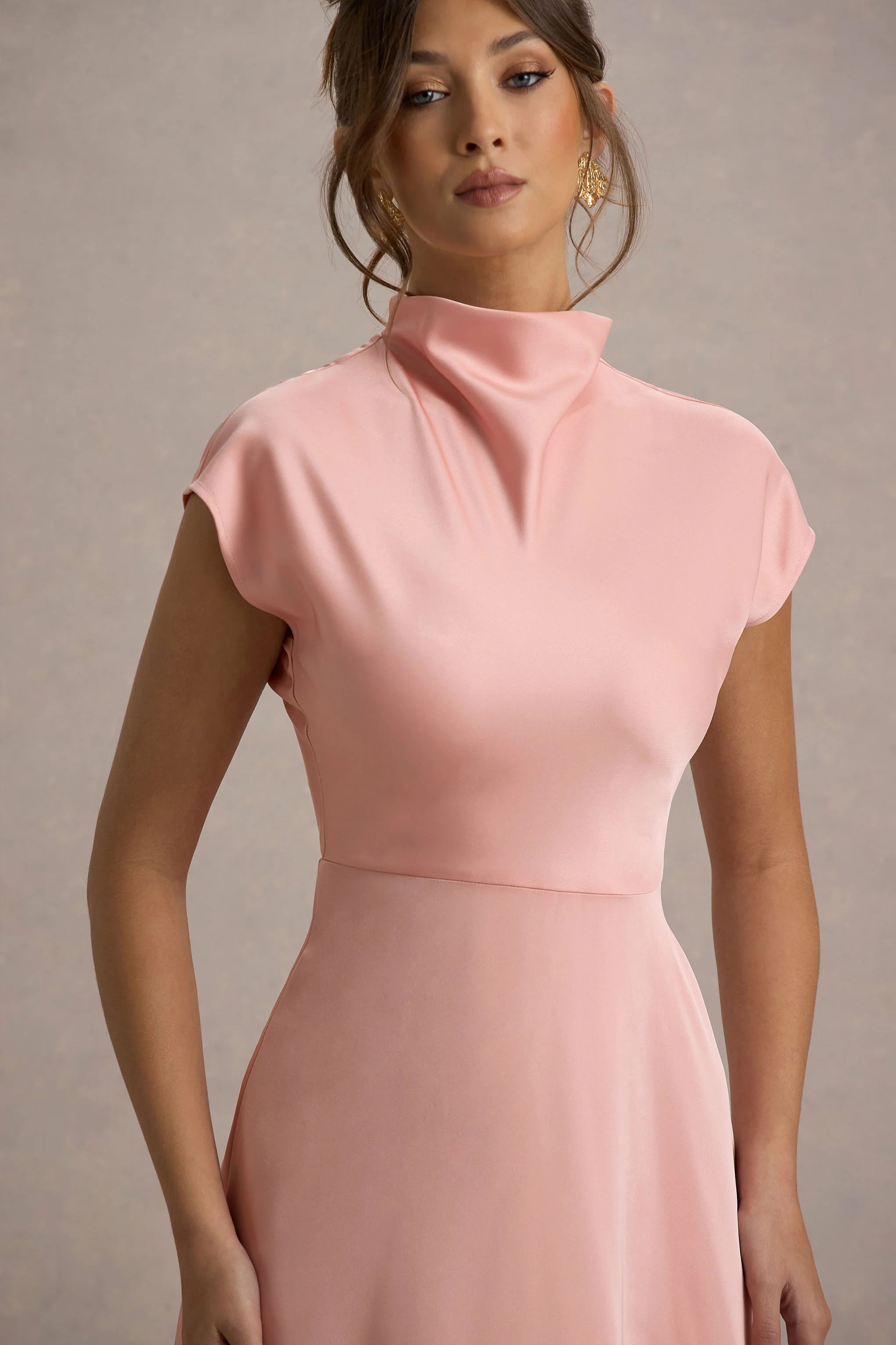 Our latest midi Velma guarantees to turn heads at every occasion, from formal dinners to garden parties. Crafted in our premium stretch satin in a gorgeous light pink hue, this piece features a high neckline draped hemline for a flattering silhouette. Pair yours with sleek stilettos for an elegant ensemble.