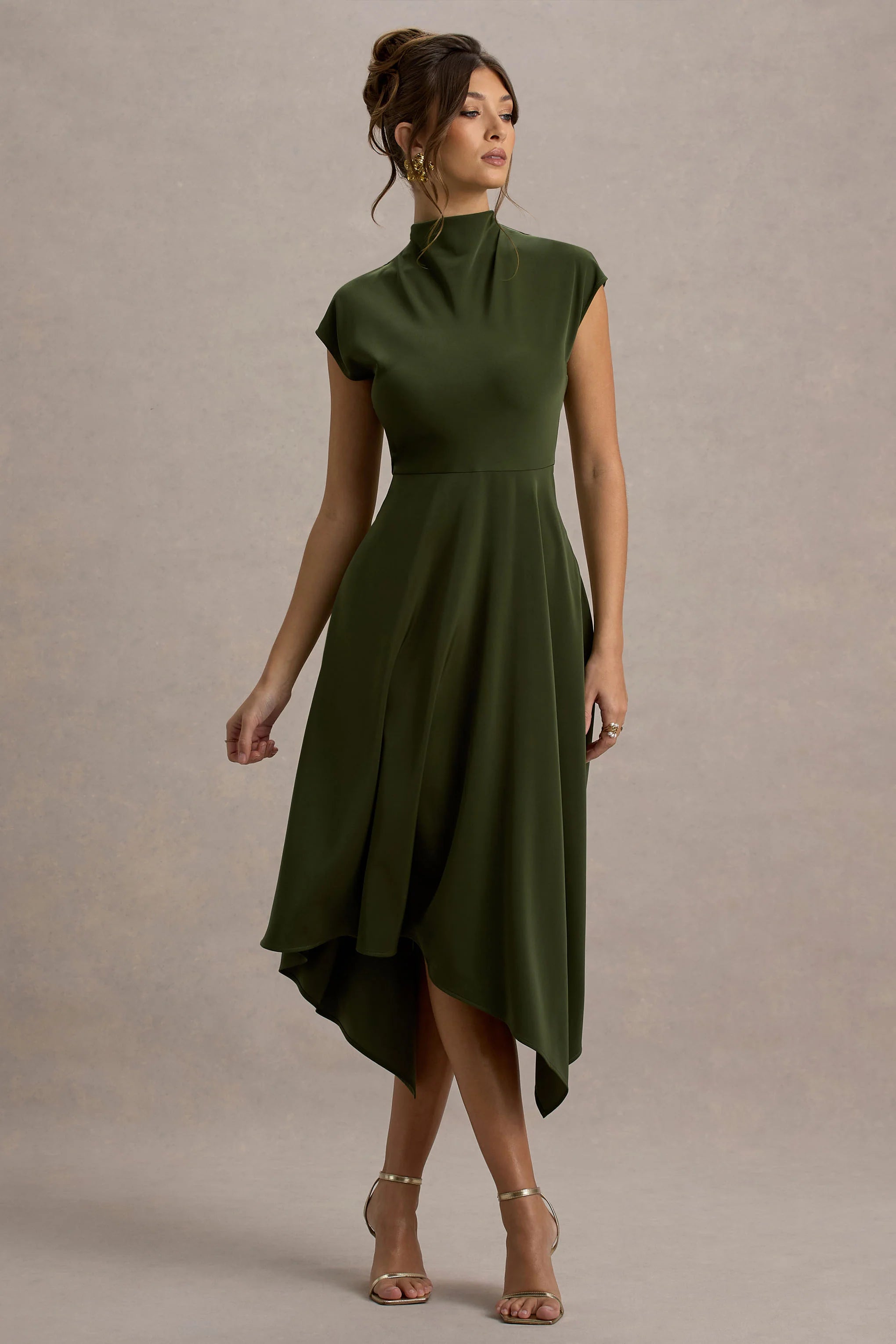 Our latest midi Velma guarantees to turn heads at every occasion, from formal dinners to garden parties. Crafted in our premium stretch satin in a gorgeous olive hue, this piece features a high neckline draped hemline for a flattering silhouette. Pair yours with sleek stilettos for an elegant ensemble.