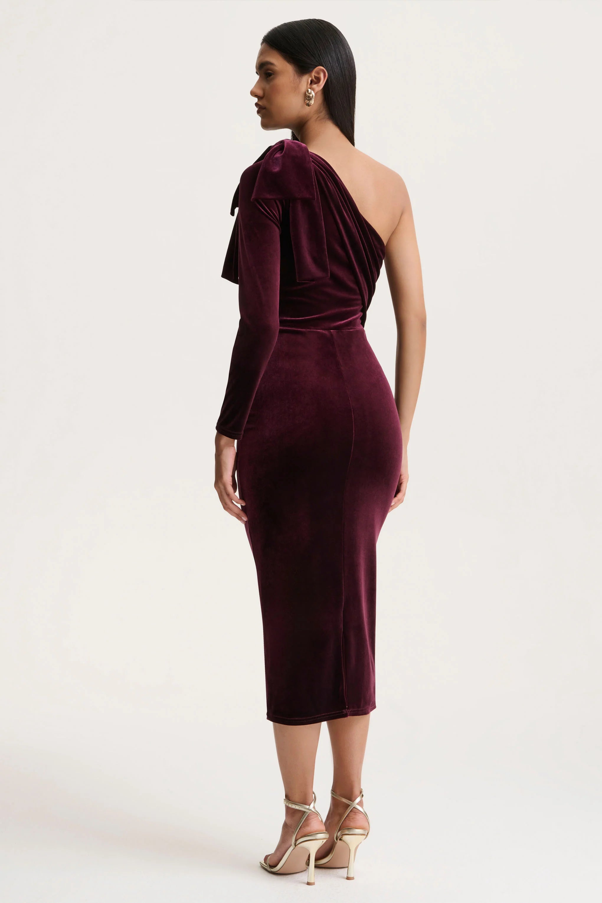 Say hello to Vespera, the midi dress that blends sophistication with statement style. Crafted from our premium velvet, its midi length and smooth silhouette flatter every curve with timeless appeal. The asymmetric neckline adds a modern edge, while the bow sleeve detail brings a touch of feminine drama. Vespera is your go-to for elegant evenings and unforgettable moments.
