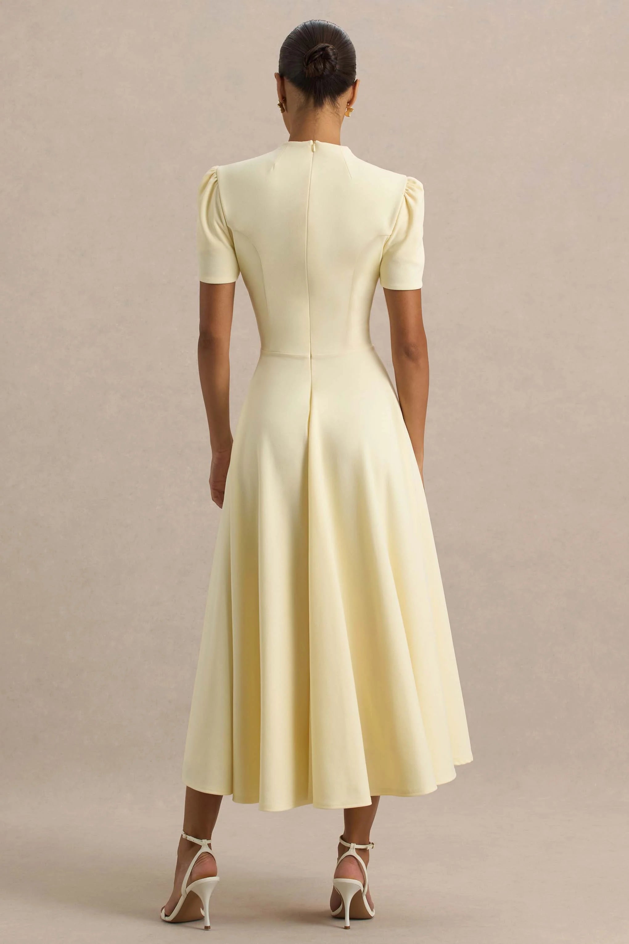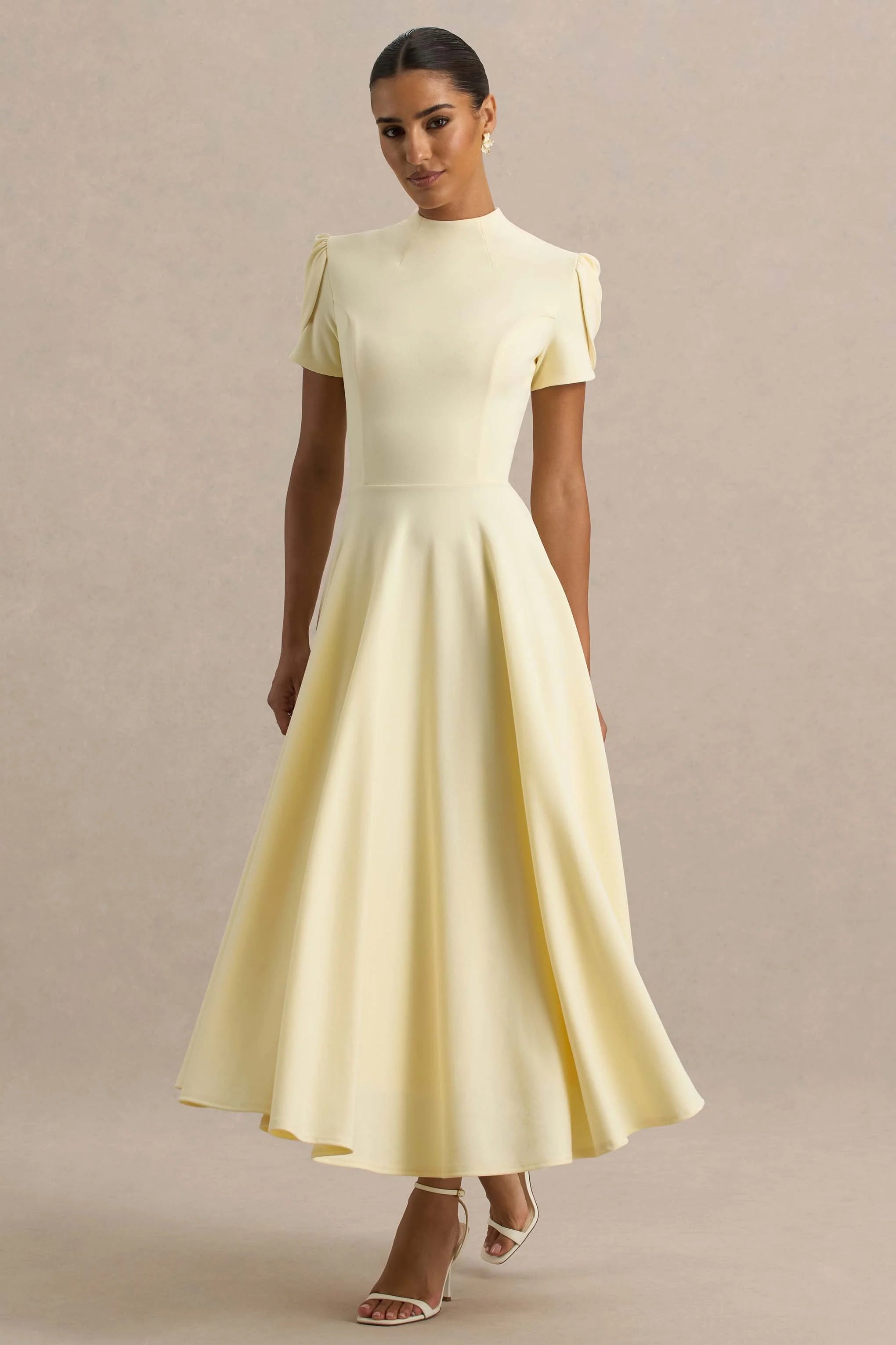 Charm with timeless elegance in our Vicky dress. Crafted from our premium scuba in a bold lemon shade, this midi dress will be your new go-to for sophisticated styling with a touch of drama. Designed to sculpt and flatter, this figure enhancing midi features a structured high neckline and short tulip sleeves for a modern yet feminine silhouette. Vicky is the perfect piece to style this season, from weddings to races, for an entrance that guarantees all eyes on you.