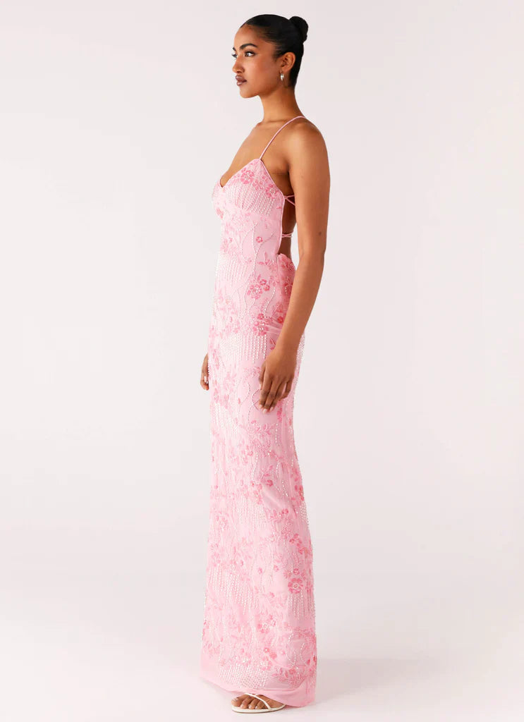 The Vietta Sequin Cami Maxi Dress is made for shimmering entrances and golden hour glamour. Featuring a V neckline and thin criss-cross adjustable straps, this fully lined maxi dress stuns with an open back and all-over beaded material.