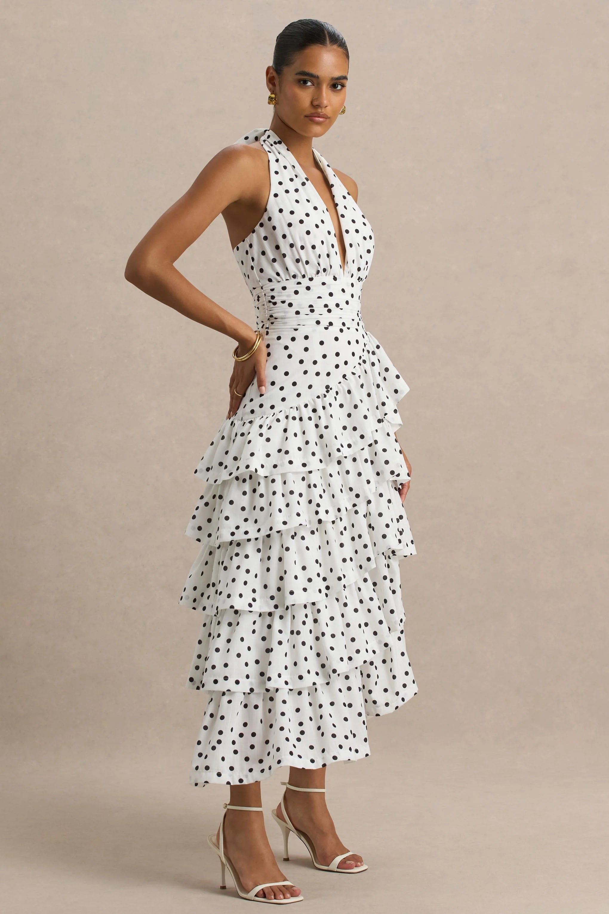 The it dress of the season has arrived, timeless and elegant, say hello to Violet. Crafted in a bold white polka dot print of our premium linen look, this midi dress is perfect for any dressed up moment this season. Violet features a chic self-tie halter neckline, to elegantly display your decolletage, that finishes in a stunning bow detail at the neck adding a touch of romance. The skirt is adorned in ruffling detail that adds a romantic and dramatic edge to this piece, ensuring an eye catching finish. From sunset cocktails that lead to elegant dinners, in Violet you are set for any occasion.