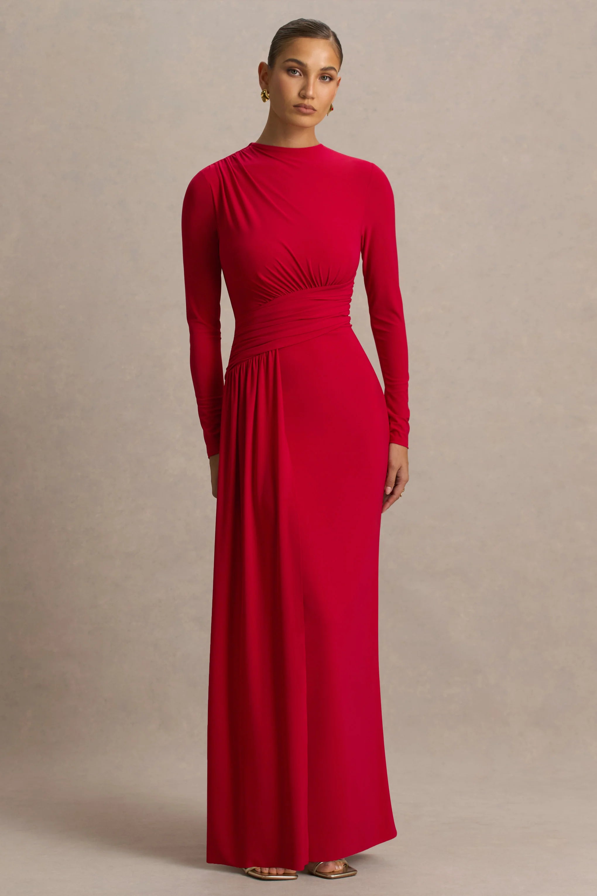 Sophisticated with a sultry twist, Virelle is the ultimate figure-enhancing maxi for statement-making evenings. Crafted from our premium stretch jersey in a deep, red hue, this design smooths and sculpts the body effortlessly. The classic boat neckline balances the dramatic, asymmetric wrap detail that draws the eye and defines the waist. Finished with flattering ruching and a soft sash that cascades elegantly over the skirt, Virelle is the perfect blend of timeless style and contemporary edge.