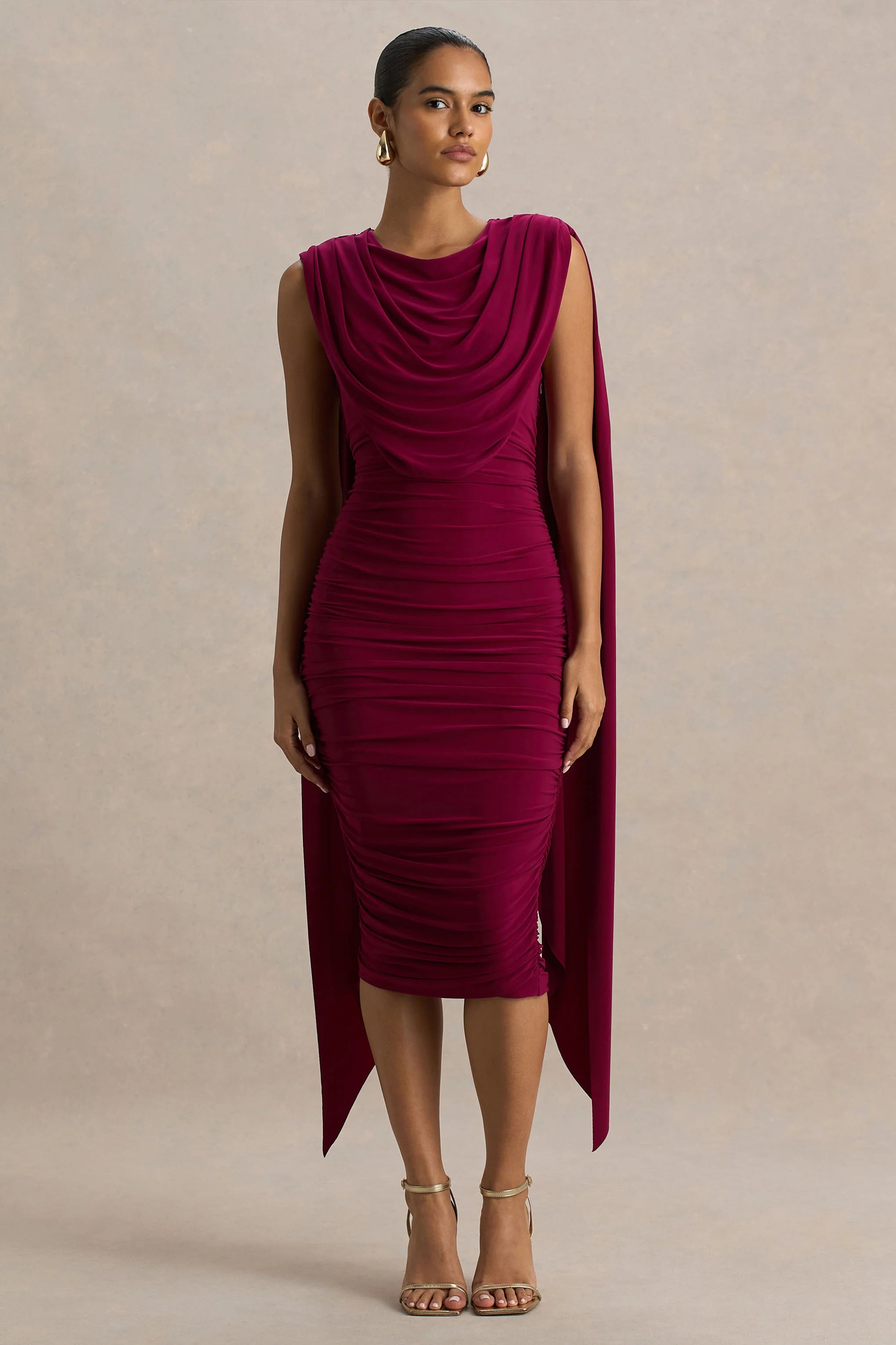 Command attention in Wanderer, a powerfully feminine silhouette designed to stun. Cut in a deep burgundy hue of our premium stretch jersey, this midi is designed to sculpt and define your curves. Featuring all over ruched detailing for the ultimate figure flattering finish and statement draped panels that cascade from the shoulders, adding movement and drama with every step. Wanderer is the perfect option for a head turning entrance.