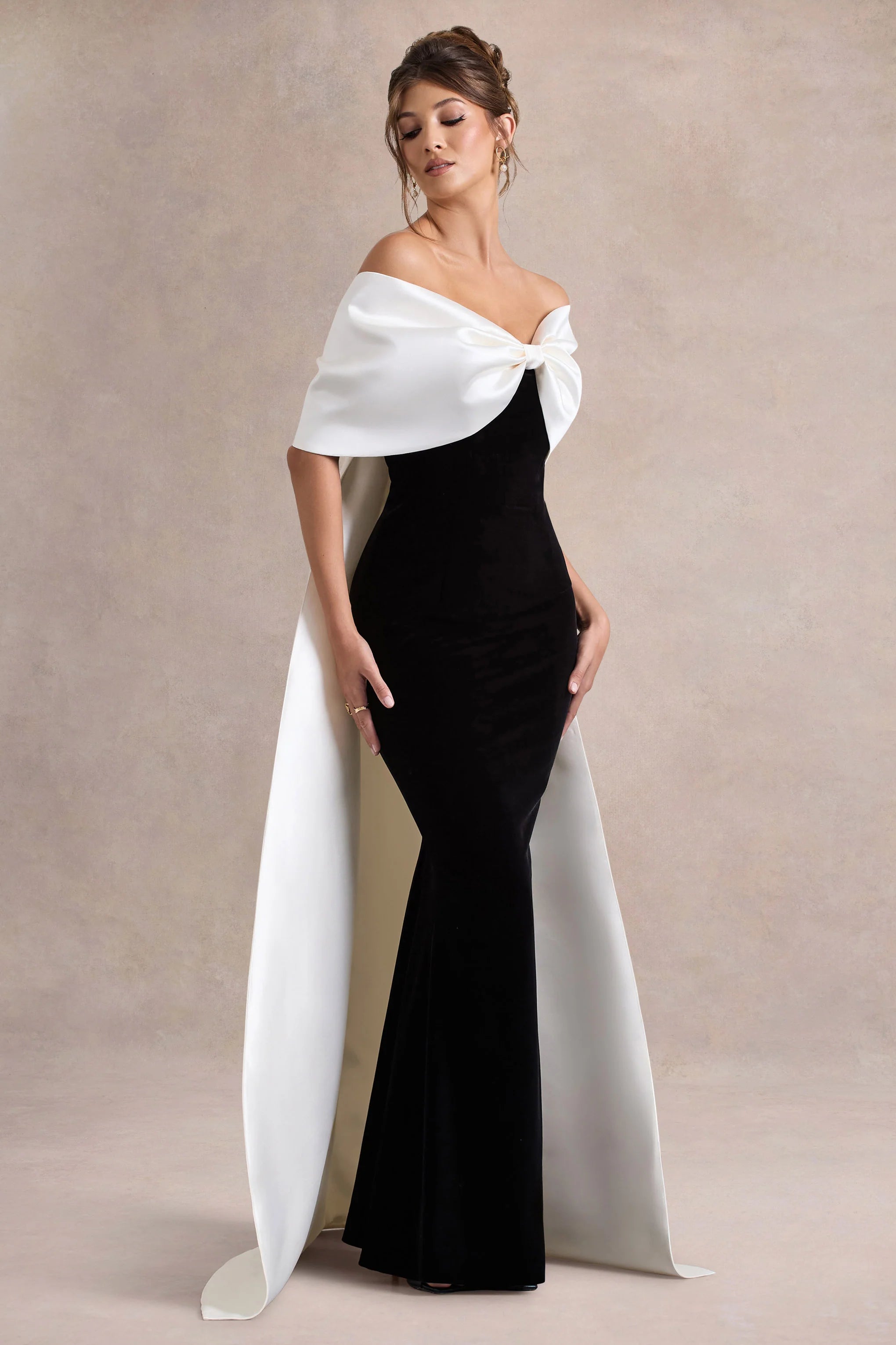 Indulge in elegance this event season with our aptly-named maxi dress, Wanting More. Meticulously crafted from our premium black velvet and satin, this formal piece features a charming bow bardot and a floor-length cape. Perfect for black-tie occasions, elevate your look with sparkling accents like To Present.