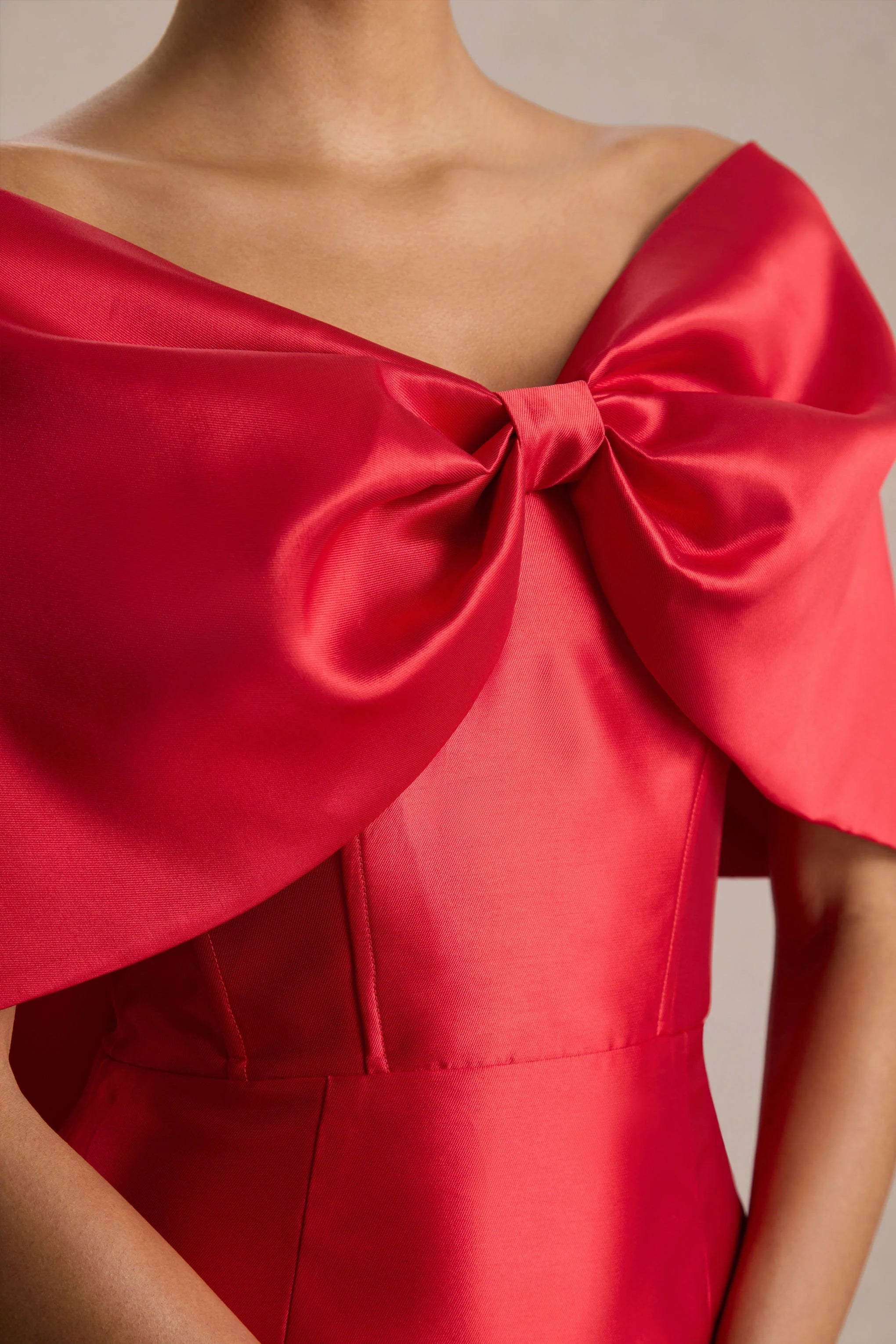 Indulge yourself in elegance this event season in our aptly-named maxi, Wanting More. Carefully crafted in a red shade of our signature satin, this formal piece is defined by a charming bow bardot and floor-length cape. The perfect black tie piece, compliment yours further with some sparkling accents like Abeam.