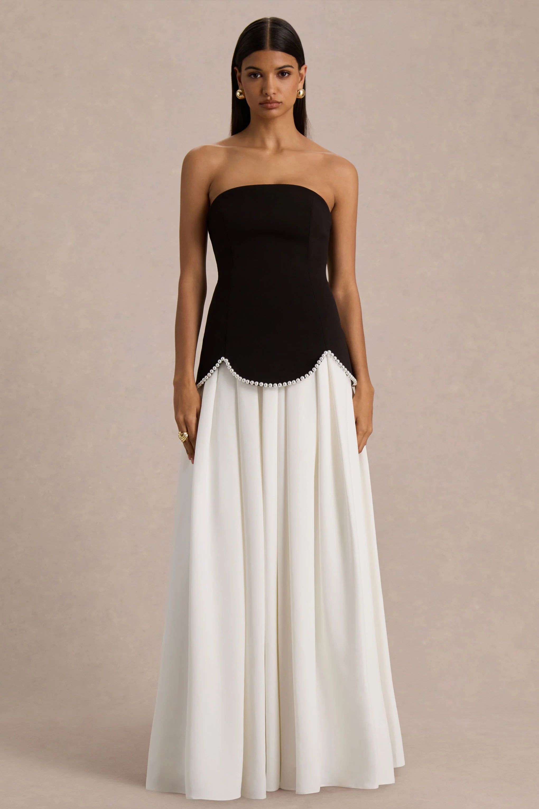 Say hello to Wendy, the maxi dress made for timeless sophistication. Crafted from our premium crepe in contrasting black and white, its floor-length silhouette flatters the figure with effortless grace. The sleek bandeau neckline exudes modern elegance, while scalloped pearl detailing adds a touch of vintage-inspired glamour. Finished with an internal corset, this gown ensures you are flattered from all angles. Wendy is your go-to for a refined take on evening dressing.
