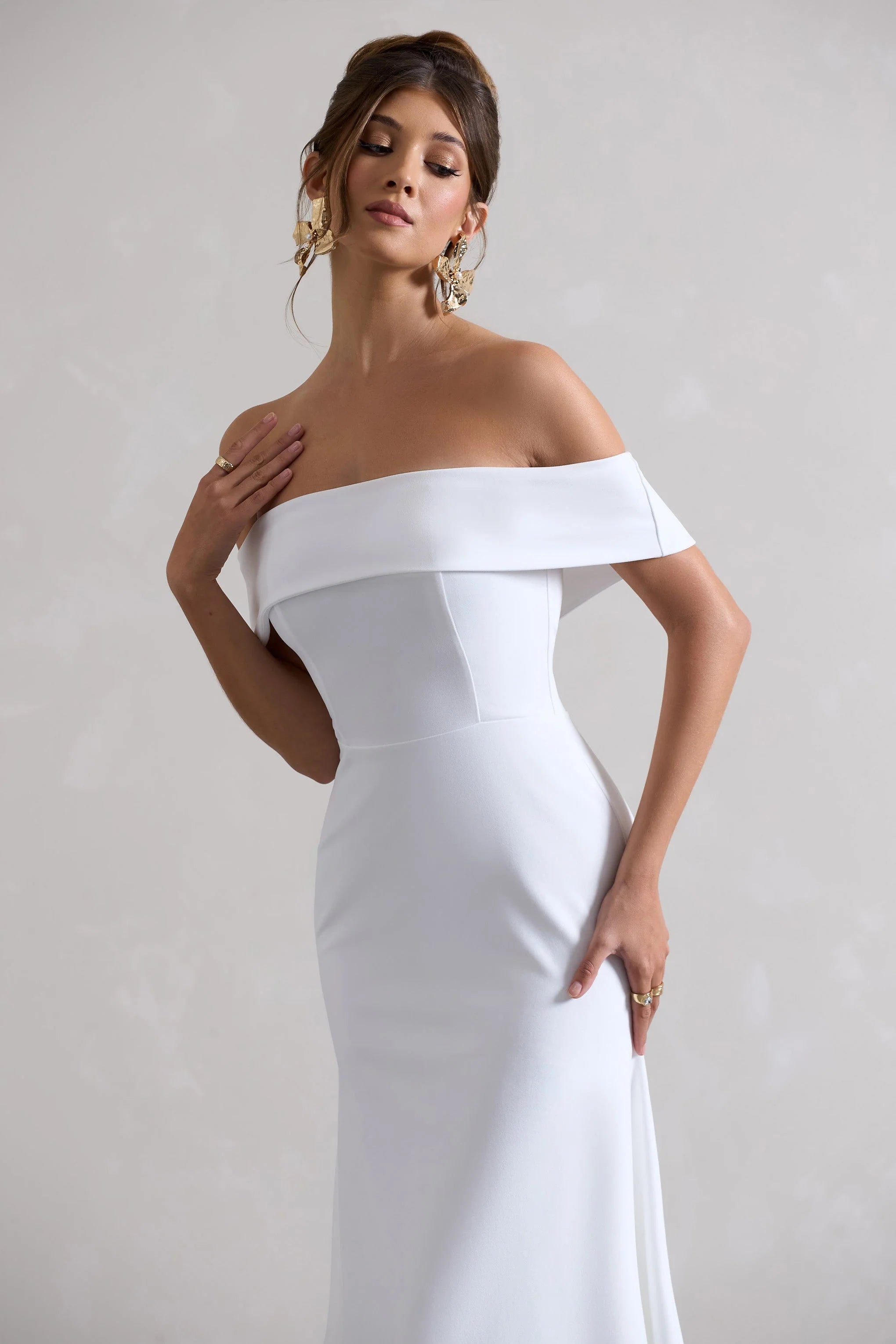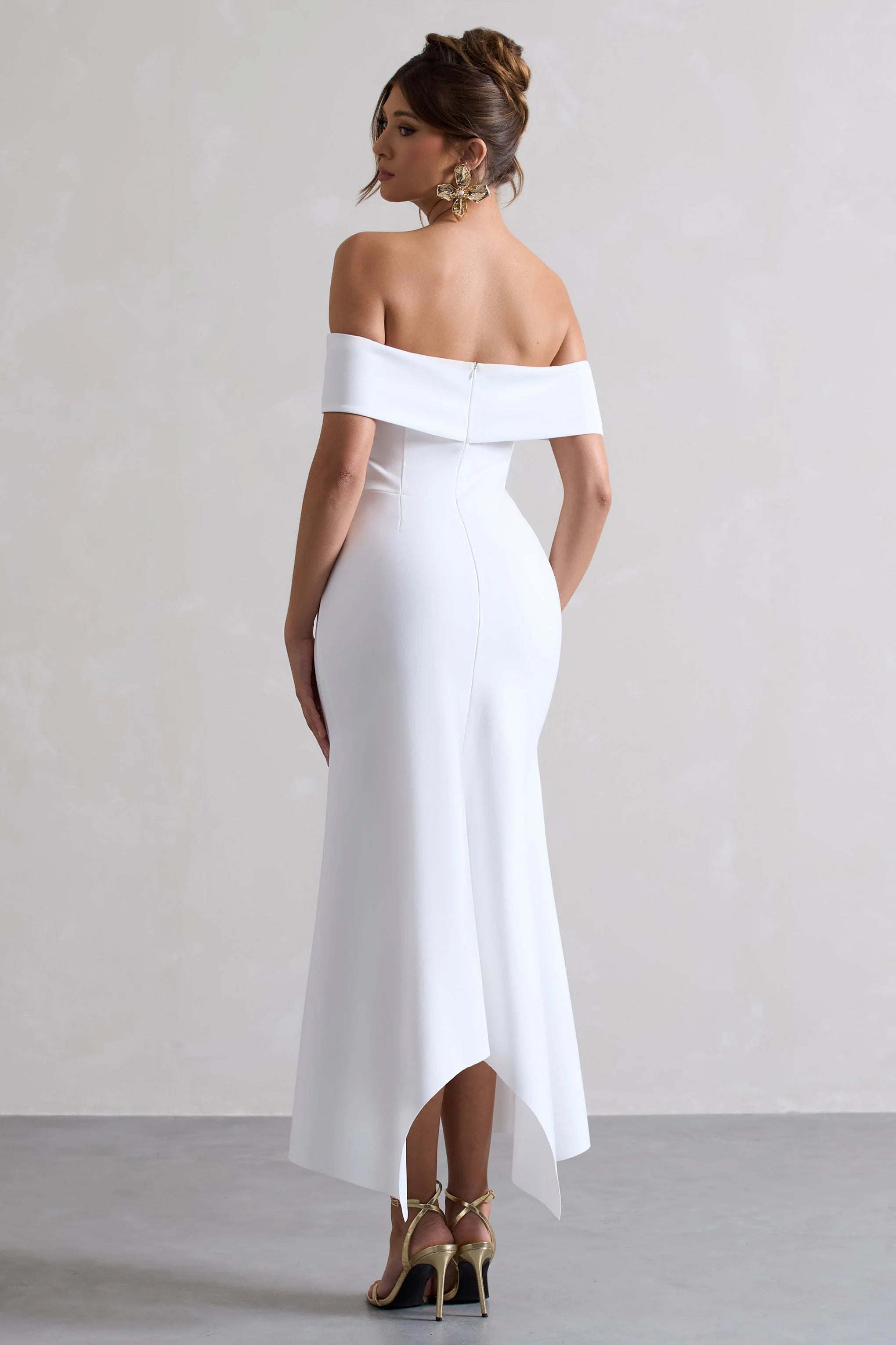 Opt for opulence in Windsor, our timeless white midi dress. Crafted in a form-flattering premium crepe, this style boasts a bardot neckline before finishing with a fluid draped hemline. For the perfect graduation look, try complimenting this midi's rich hue with some sparkling gold accents.