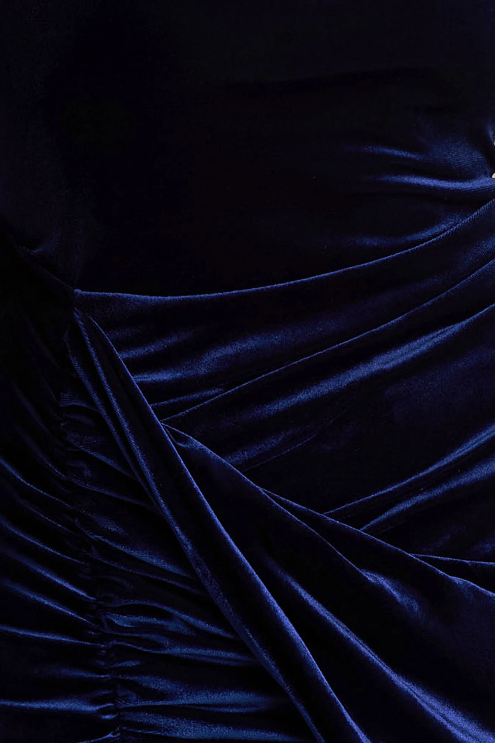 Introducing Wishes, a chic piece made to enchant. Crafted from our premium velvet, this elegant navy maxi dress is the epitome of refined glamour. Featuring a sophisticated high neckline and sleek long sleeves, Wishes exudes timeless elegance. The wrap skirt cinches effortlessly at the waist, flowing into an asymmetric hemline that adds movement and modern edge. Graceful, striking, and endlessly chic, Wishes is made for moments that deserve to be remembered.