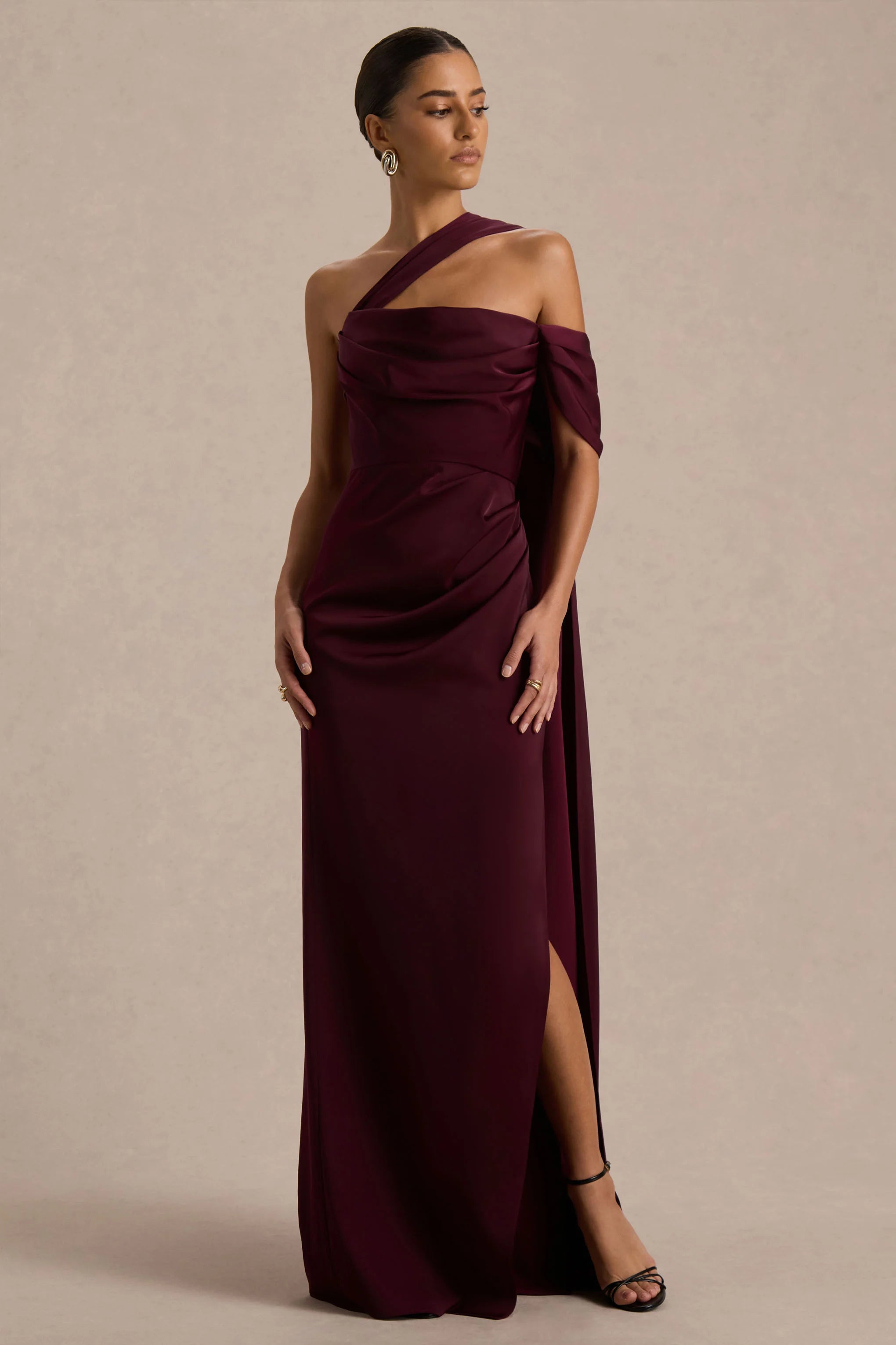 Introducing Yazmin, where red carpet glamour meets modern sophistication. Crafted from our burgundy premium satin, this stunning maxi dress is designed to command attention. The asymmetric neckline and dramatic sash detail, flowing elegantly over the shoulder and down the back, create a striking silhouette from every angle. With draped detailing at the waist to enhance your curves and a daring front-high split, Yazmin is made for unforgettable entrances and after-dark allure.