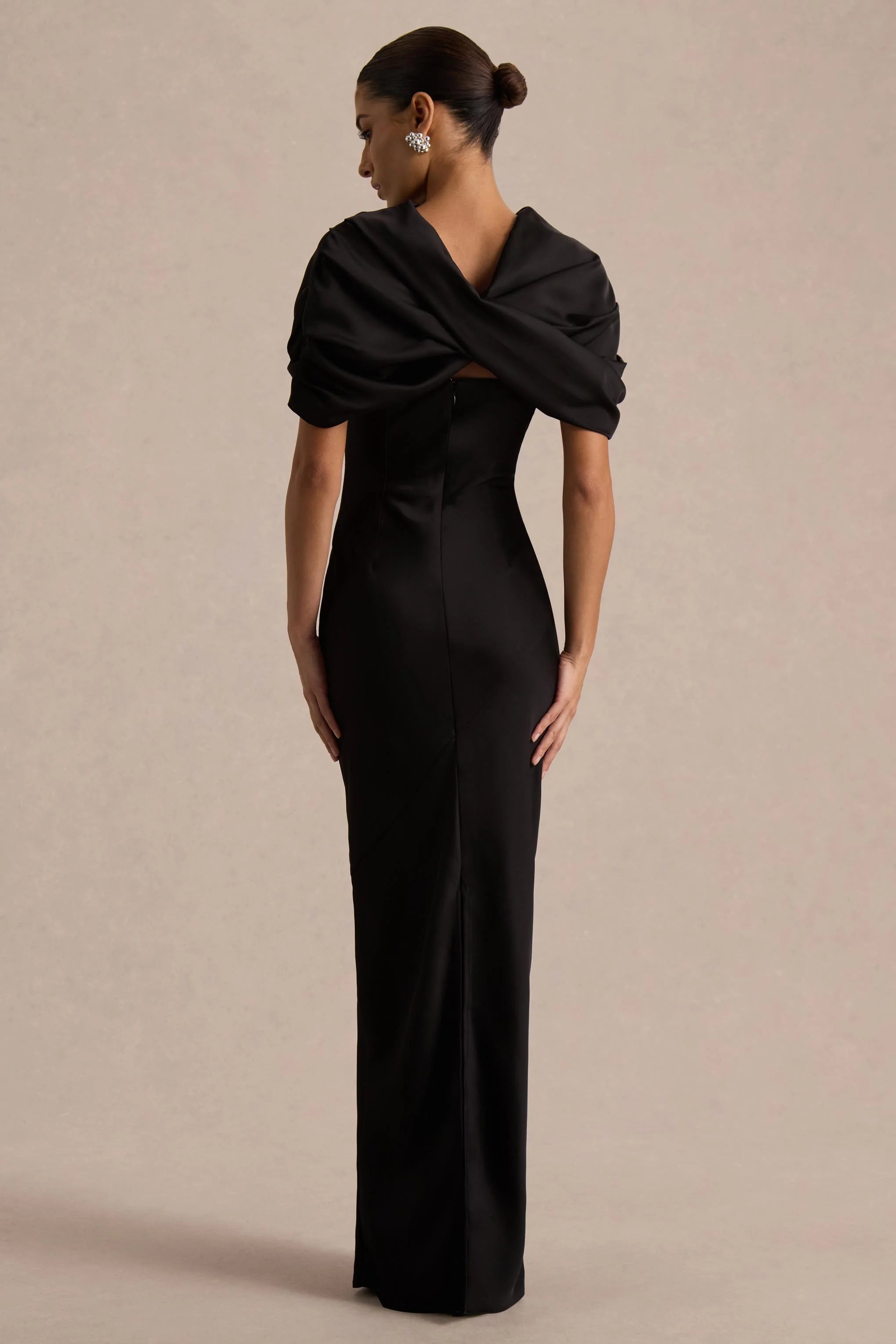 Introducing Yoli, a sleek take on modern glamour with a powerful edge. Cut from our premium black satin, this maxi dress flatters the figure with a smooth, elegant finish. The high neckline exudes sophistication, while the twisted cape overlay adds a striking twist. Finished with a centre-back split for movement, Yoli is a bold yet timeless choice for statement occasions.