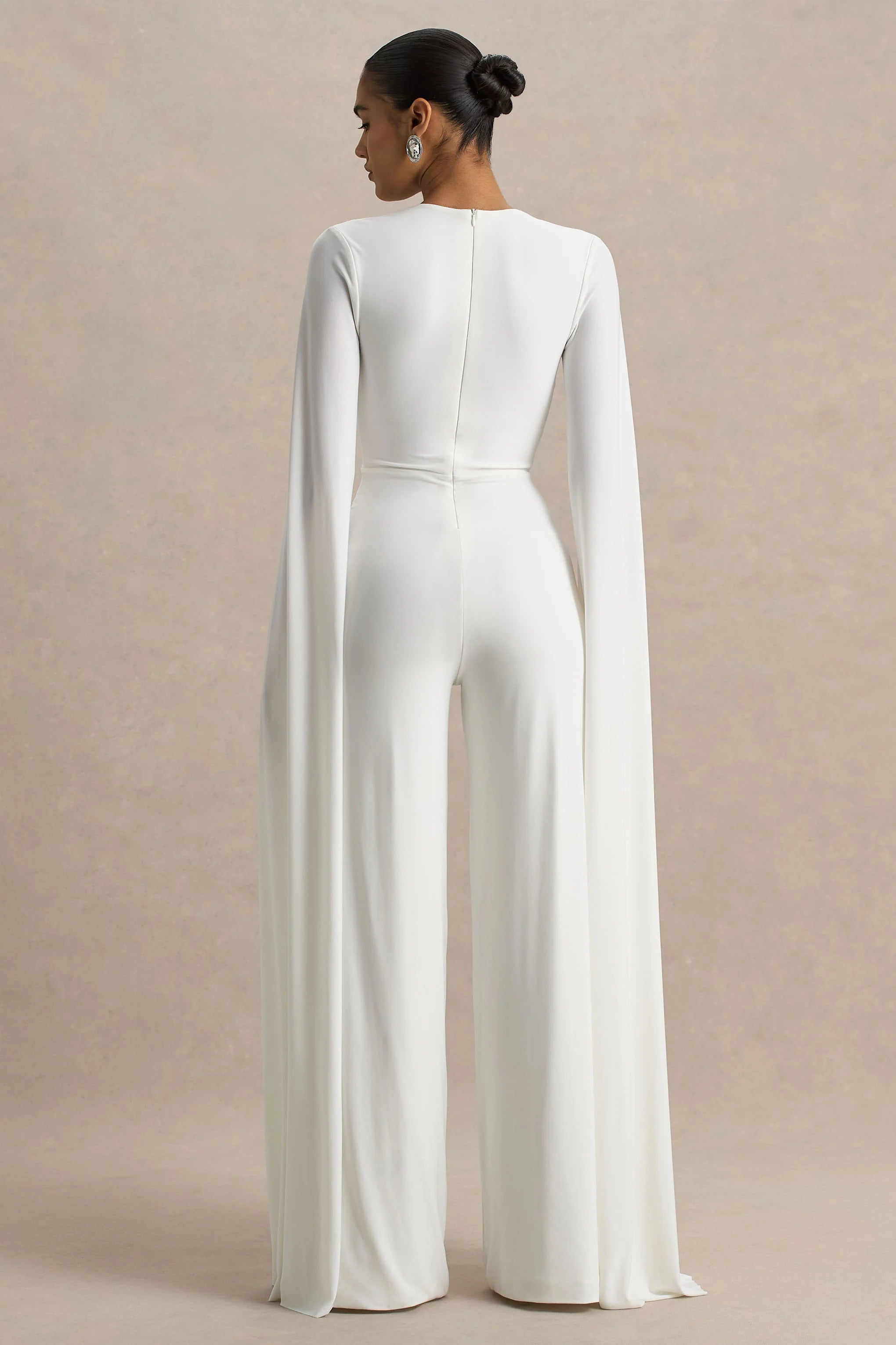 Command the rooms attention in our latest head turner, Zara. Curated from our premium scuba crepe, in a bold white hue, this jumpsuit will sculpt your curves gorgeously ensuring you feel as good as you look. Featuring a chic square neckline and dramatic cape sleeves, this piece exudes glamour and elegance at any upscale occasion. Style with sleek heels for a look that'll have all eyes on you.