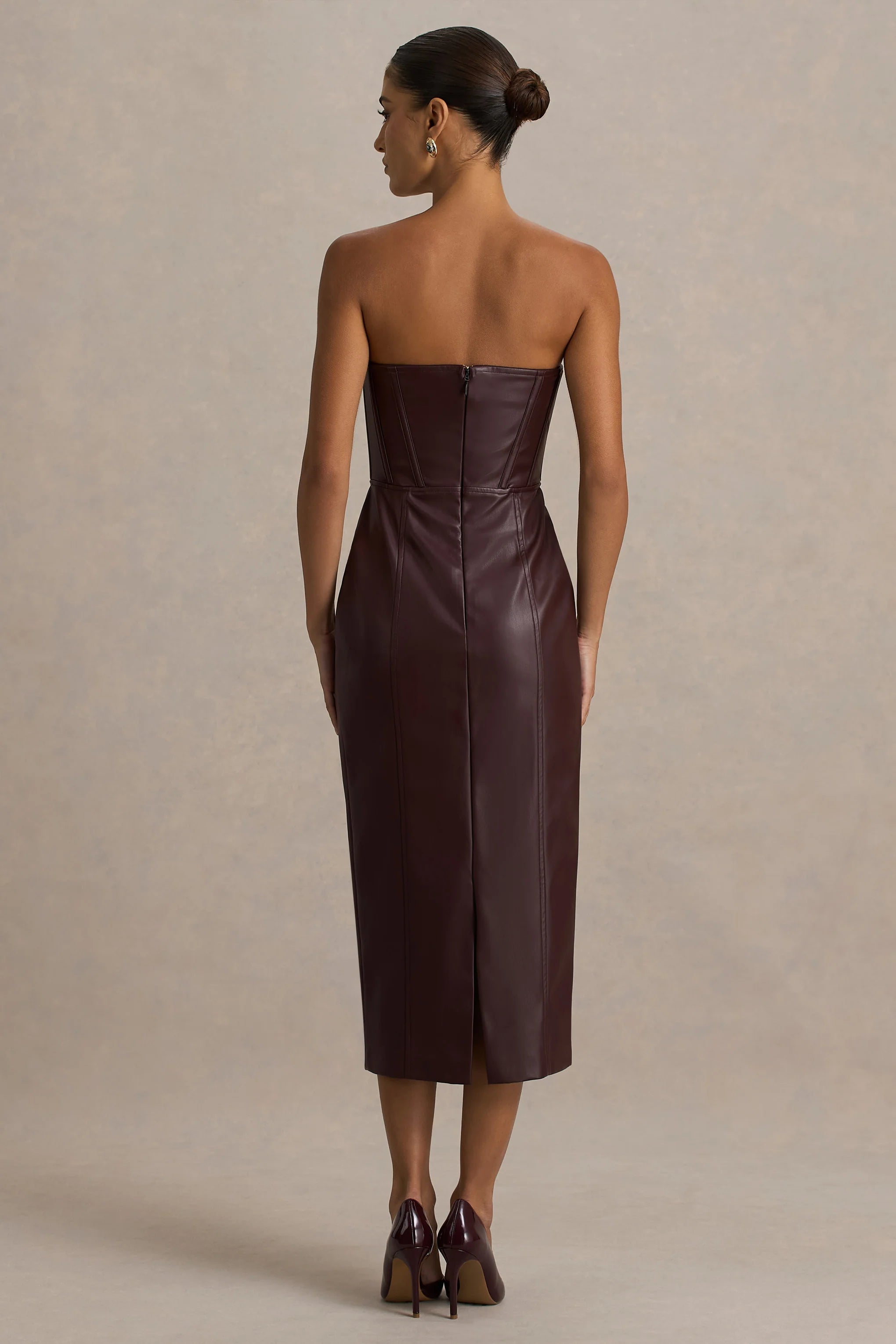 Fierce, feminine, and unapologetically bold, Zola is the ultimate power piece for your occasion-wear wardrobe. Designed in rich burgundy shade of our premium faux leather, this figure-contouring midi dress will flatter you from all angles. Featuring a sleek bandeau neckline and a structured bodice adorned with sultry hook and eye detailing for a touch of allure. Finished with a centre-back split that adds ease and a sultry touch, making Zola your go-to for nights that demand attention. Style with sleek heels and gold accessories for a head-turning moment.