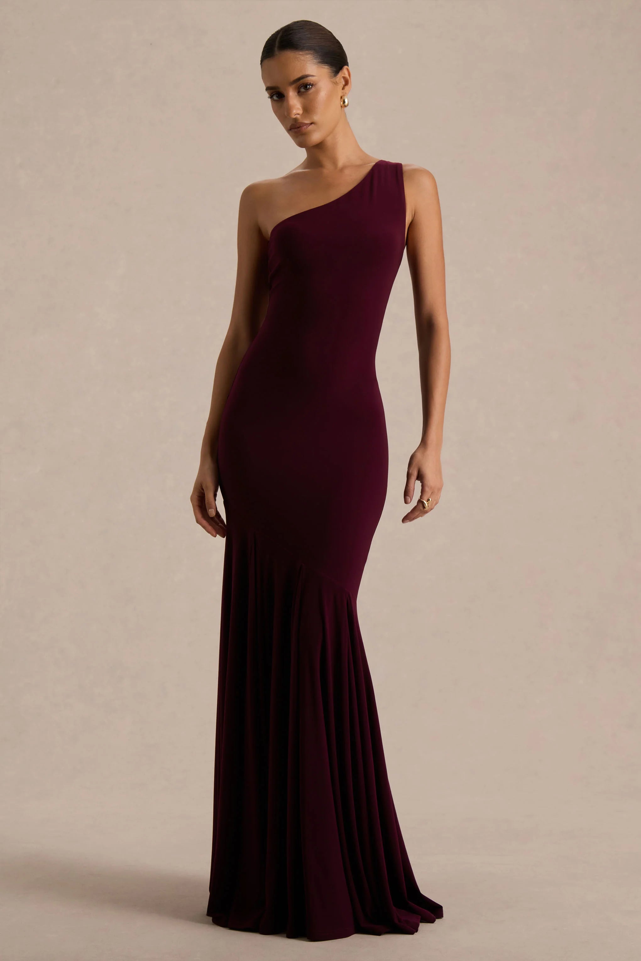 Make every entrance unforgettable in Zya, a dramatic gown designed for effortless elegance. Crafted in a dark plum hue of our premium stretch jersey, this maxi dress features a striking asymmetric neckline and an asymmetric drop-waist for a modern, feminine silhouette. Zya is perfect for formal occasions or any moment you want to exude confidence and style. Style with gold accessories and a sleek up-do to tie the look together.